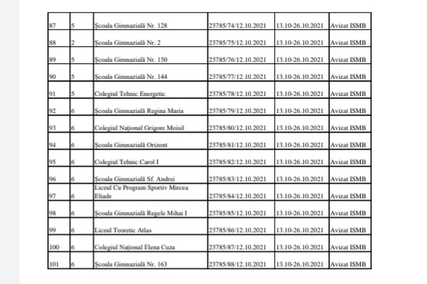 – Școala Gimnazială nr. 135 – Calea Ferentarilor Nr. 72, sector 5, pentru perioada 12.10-25.10.2021;