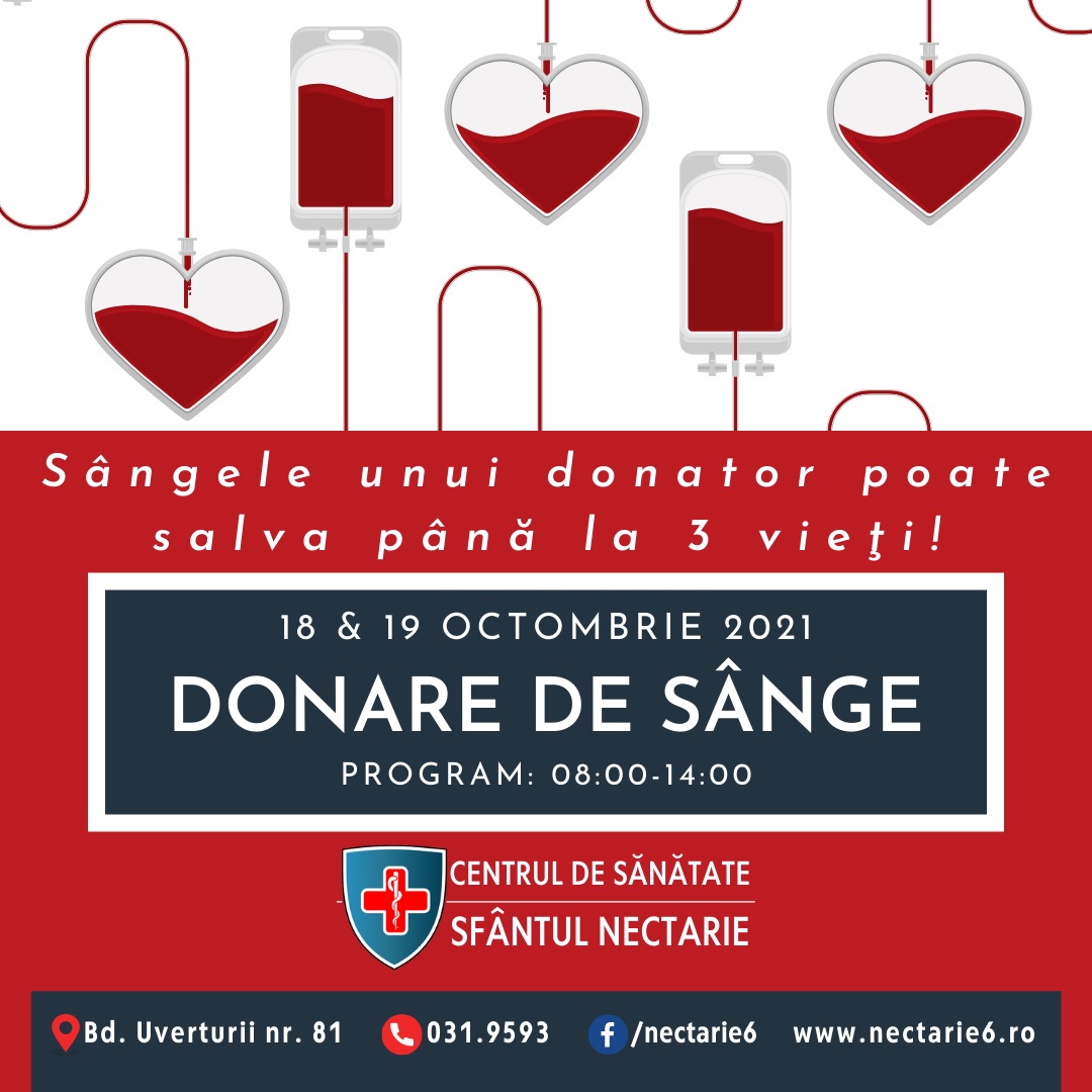 Din dorința de a sensibiliza opinia publică cu privire la criza de sânge din spitale, știut fiind faptul că doar 2% din populația țării donează sânge, Centrul de Sănătate „Sfântul Nectarie” va găzdui unitatea mobilă a Spitalului Universitar de Urgenţă Militar Central „Dr. Carol Davila” pentru două zile consecutiv.