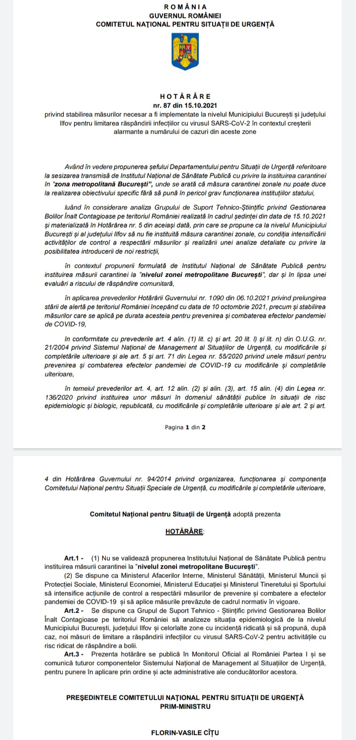 Comitetul Național pentru Situații de Urgență a aprobat Hotărârea numărul 87 privind stabilirea măsurilor necesar a fi implementate la nivelul Municipiului București și județului Ilfov pentru limitarea răspândirii infecțiilor cu virusul SARS-CoV-2.