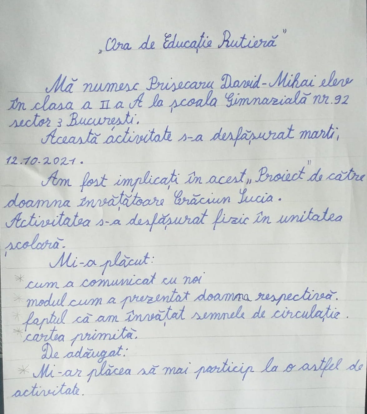 „Mi-a plăcut: cum a comunicat cu noi; modul cum a prezentat doamna respectivă; faptul că am învățat semnele de circulație; cartea primită. Mi-ar plăcea să mai particip la o astfel de activitate”, declară un elev din clasa a III-a, școală gimnazială din Sectorul 3.