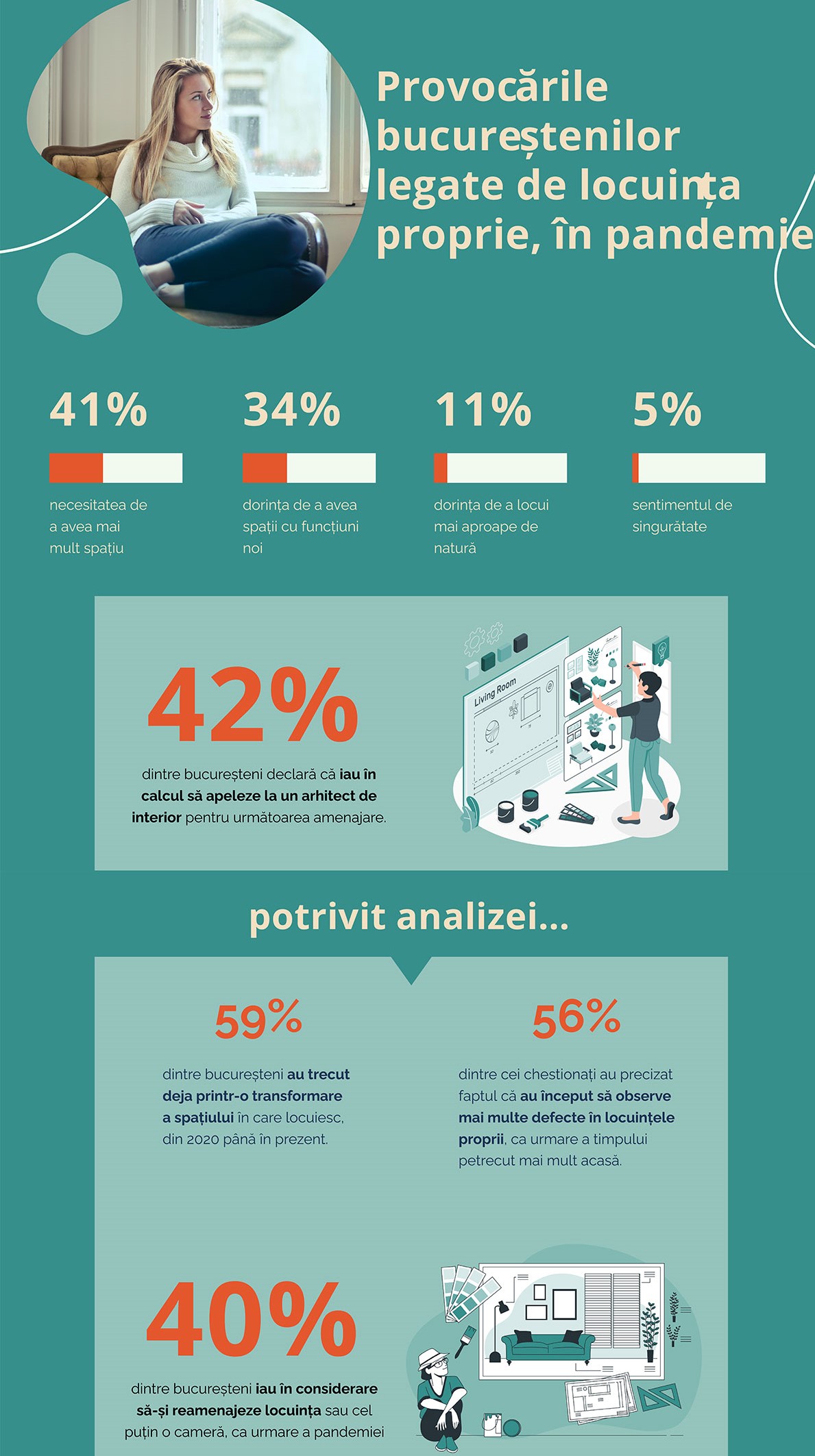 Conform unei analize derulate de un studio de soluții complete de design interior, 40% dintre bucureșteni iau în considerare transformarea întregii locuințe sau cel puțin a unei camere, ca urmare a contextului pandemic. Potrivit aceleiași analize, 59% dintre bucureșteni au trecut deja printr-o transformare a spațiului în care locuiesc, din 2020 până în prezent.