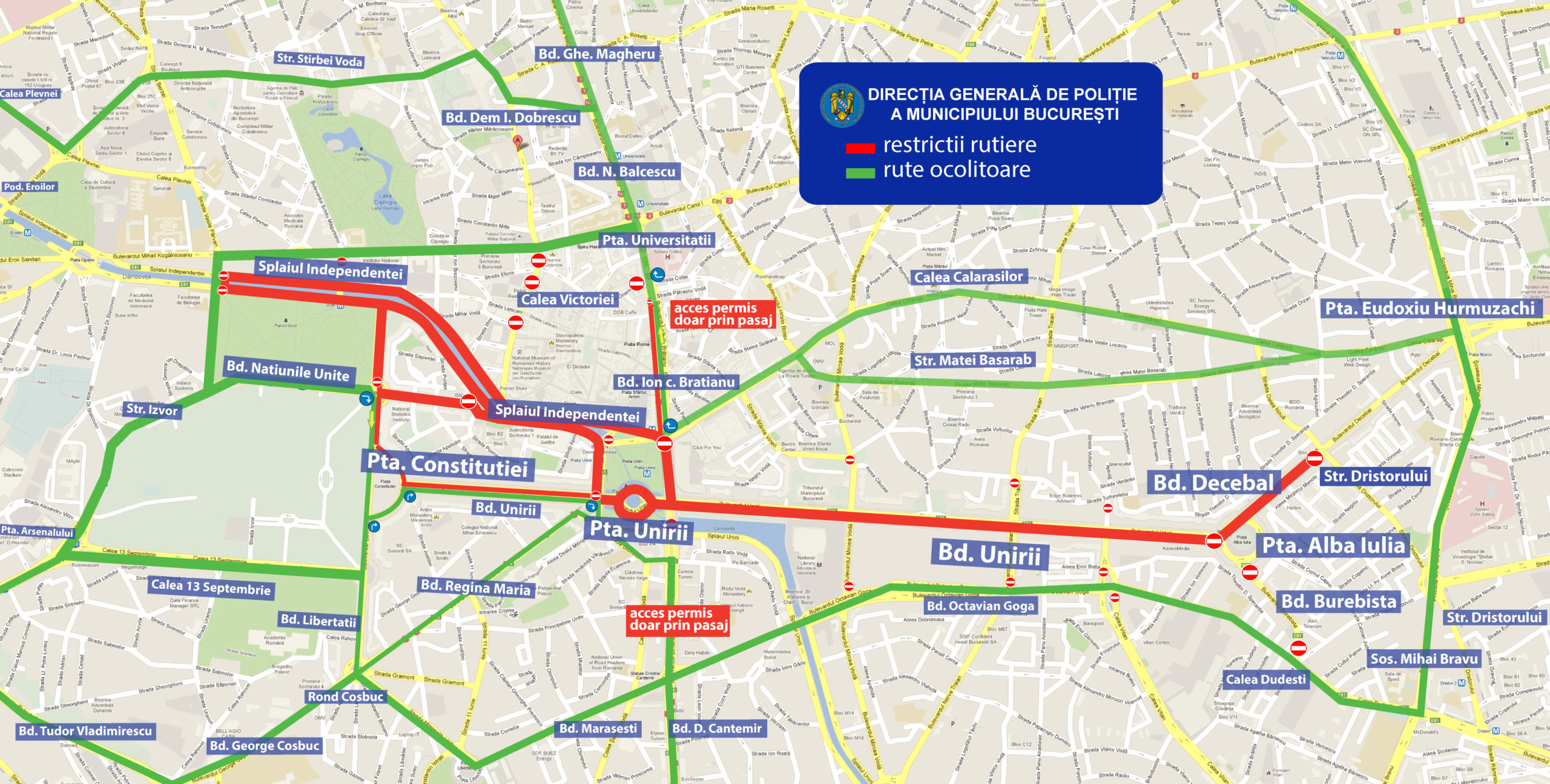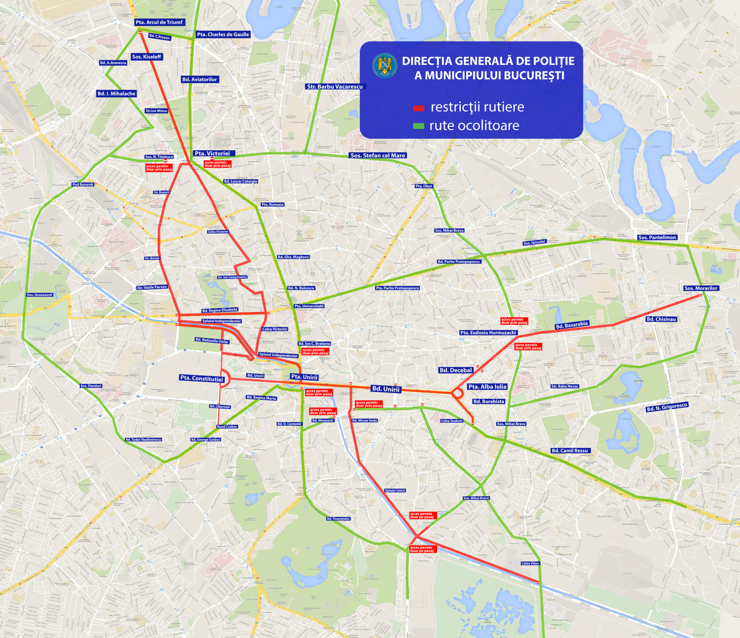 Poliţiştii recomandă, ca rute alternative, bulevardul Mihail Kogălniceanu – Piaţa Universităţii – bulevardul Nicolae Bălcescu – bulevardul Gh. Magheru; bulevardul Naţiunile Unite – strada Izvor – bulevardul Tudor Vladimirescu – bulevardul George Coşbuc – bulevardul Regina Maria; bulevardul I.C. Brătianu – Calea Călăraşilor – Piaţa Hurmuzachi; bulevardul Mărăşeşti – bulevardul Dimitrie Cantemir – bulevardul Octavian Goga – Calea Dudeşti – şoseaua Mihai Bravu – Piaţa Hurmuzachi.