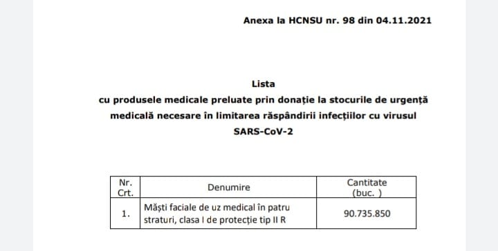 Art.1 – Se aprobă preluarea la stocurile de urgență medicală a unui număr de 90.735.850 de măști faciale de uz medical în patru straturi, clasa I de protecție tip II R, prin donație de la Societatea de Administrare a Participațiilor în Energie.