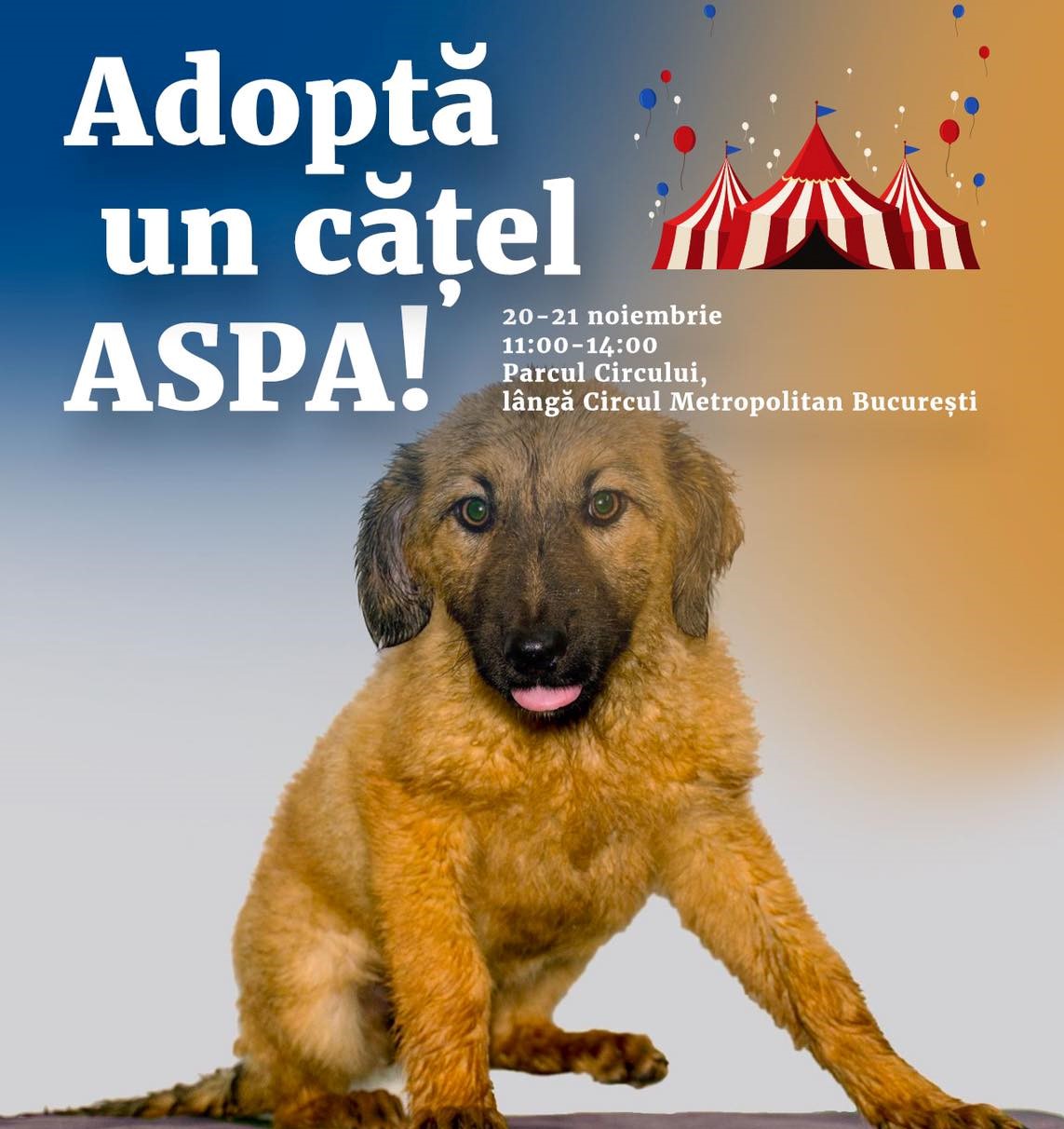 Primăria Capitalei şi ASPA îi invită pe iubitorii de animale, şi în acest weekend (20-21 noiembrie), în intervalul orar 11:00-14:00, în Parcul Circului de lângă Circul Metropolitan București, la o nouă ediţie a târgului de adopții.