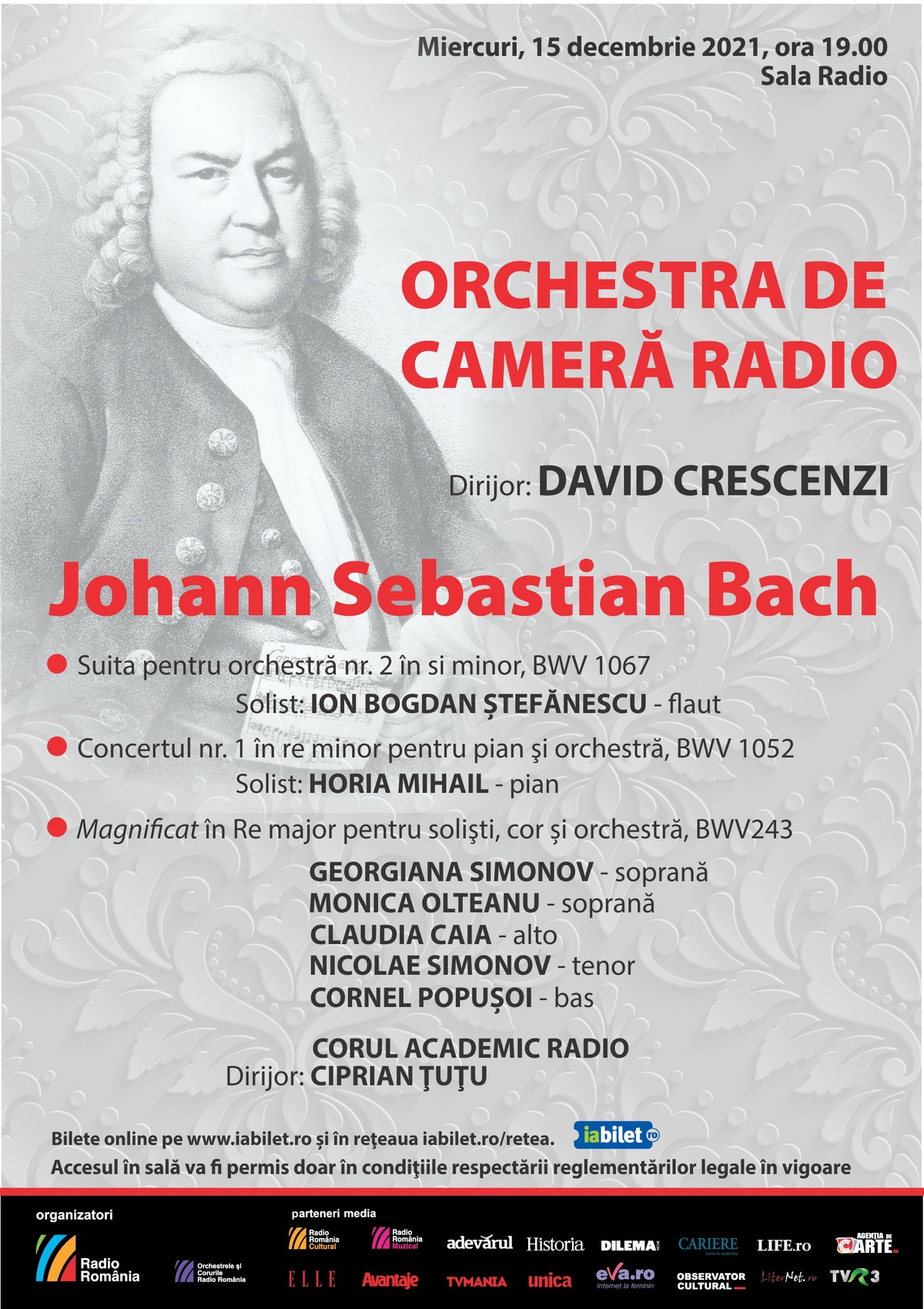Miercuri, 15 decembrie (de la ora 19:00), Orchestra de Cameră Radio dăruiește publicului un concert 100% Bach, derulat la Sala Radio. „Eu cânt notele așa cum sunt scrise, dar Dumnezeu este cel care creează muzica” – mărturisea Bach despre felul în care privea arta sunetului.