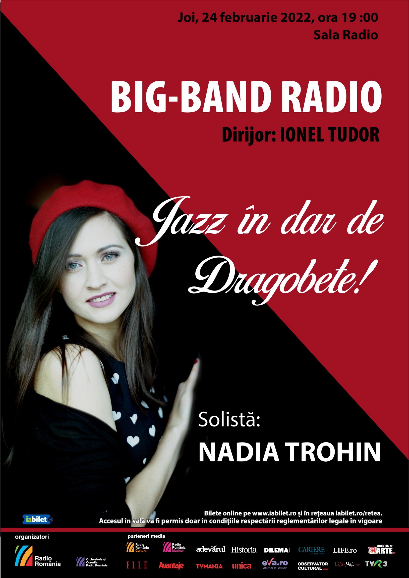Ce poate fi mai frumos pentru o seară de Dragobete decât un concert de jazz? Sub titlul Jazz în dar de Dragobete, joi, 24 februarie (de la ora 19:00), Nadia Trohin – una dintre tinerele voci apreciate pe scenele de jazz din România, concertează la Sala Radio alături de Big Band-ul Radio, dirijat de Ionel Tudor.