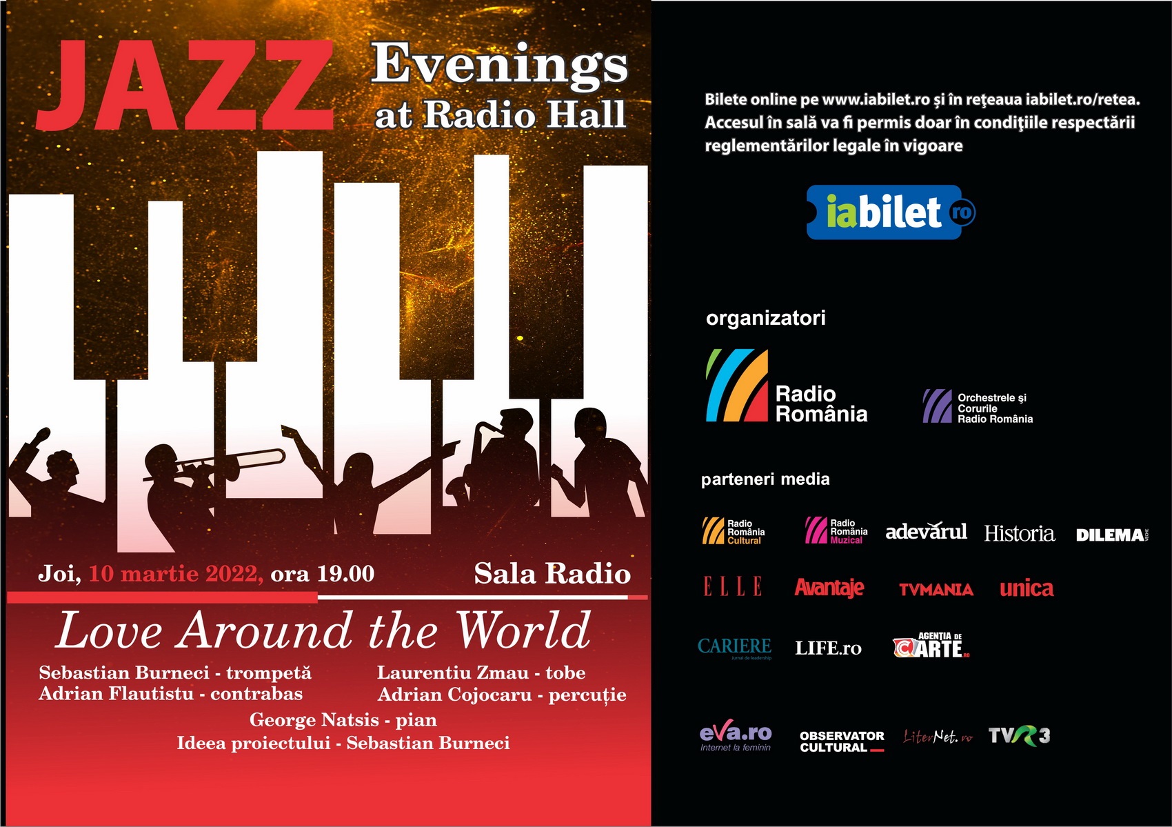 Joi, 10 martie, de la ora 19:00, jazz-ul cucerește din nou Sala Radio, de această dată cu o seară dedicată pieselor create în jurul iubirii. Sub titlul Love Around the World (Dragoste în jurul lumii), evenimentul conceput de trompetistul Sebastian Burneci propune publicului piese ca Blame it on my Youth, I Wish You Live, I Fall in Love to Easily, Guarda che luna, Somos novios, Love Has Come ș.a.