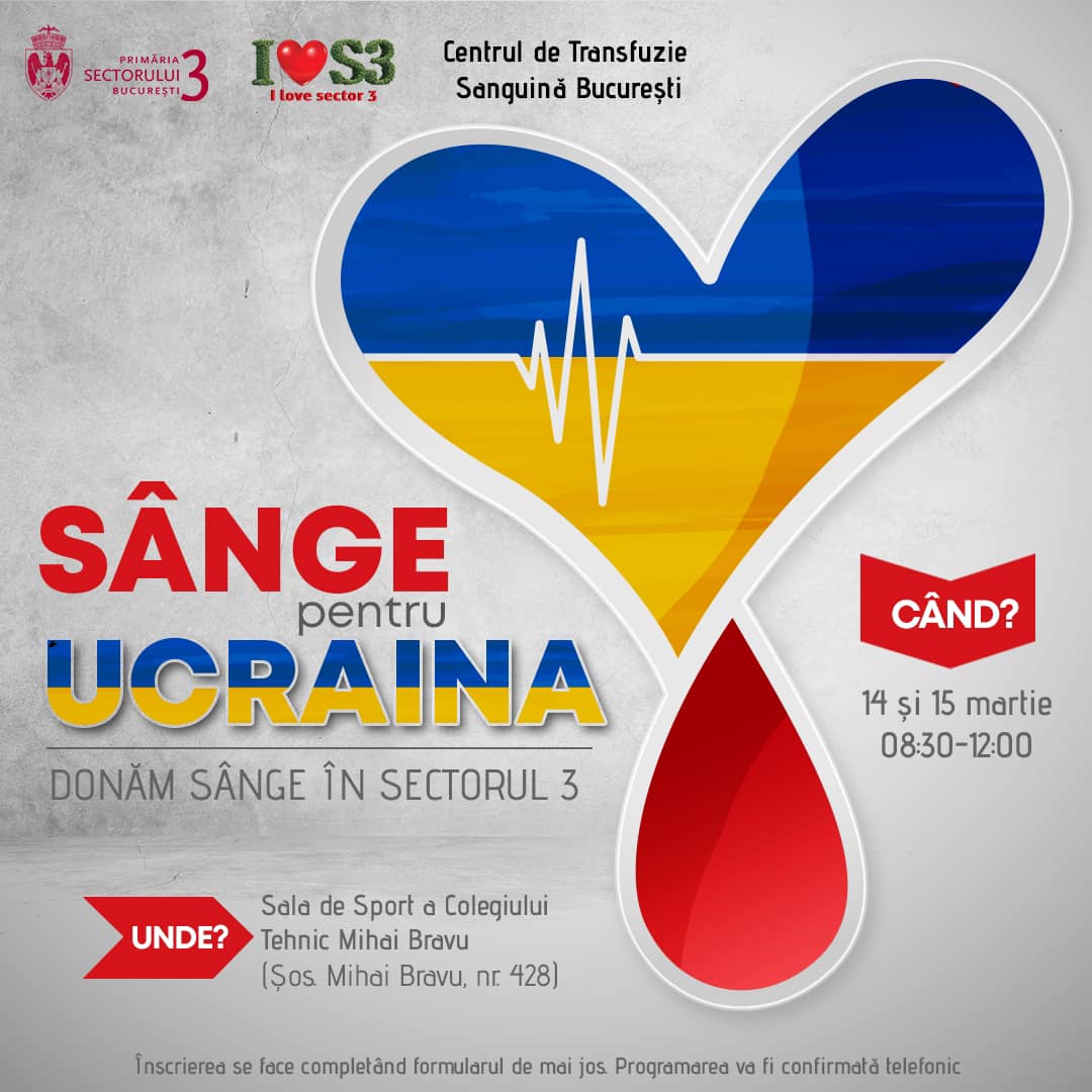 Primăria Sectorului 3 şi Centrul de Transfuzie Sanguină Bucureşti organizează o campanie de donare de sânge pentru Ucraina, în perioada 14 -15 martie, la Colegiul “Mihai Bravu”.