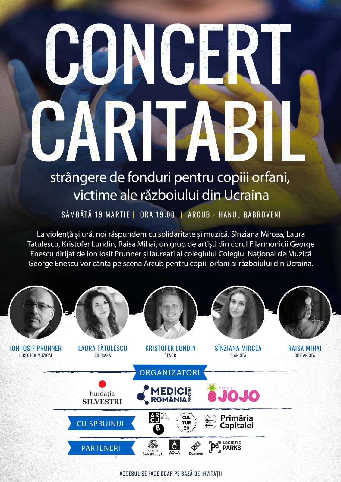 Sâmbătă, 19 martie, de la ora 19:00, Medici pentru România, Fundația Silvestri și Asociația Jojo, cu sprijinul PMB și ARCUB, organizează un concert caritabil cu strângere de fonduri pentru copiii orfani din Ucraina.