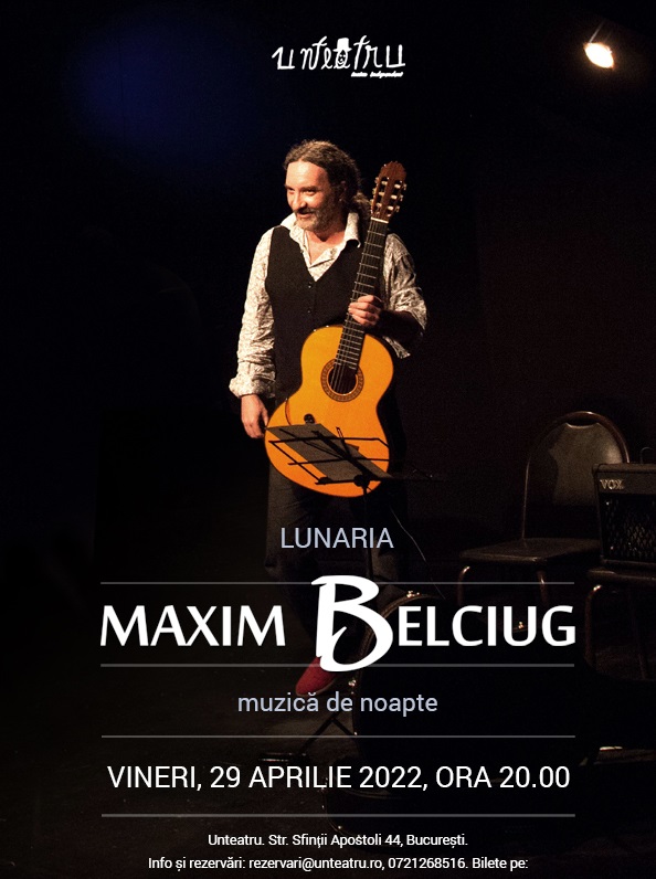 Vineri, 29 aprilie, cu începere de la orele 20:00, la Unteatru e seară de concert. Îndrăgitul chitarist al încântărilor revine în sala din strada Sfinții Apostoli pentru a oferi un recital extraordinar de chitară solo, pe care organizatorii îl prefațează astfel: muzică de noapte cu tumult și șoapte, cântată în strună de-o chitară nebună, culeasă din lună cu-al său meșteșug de Maxim Belciug.