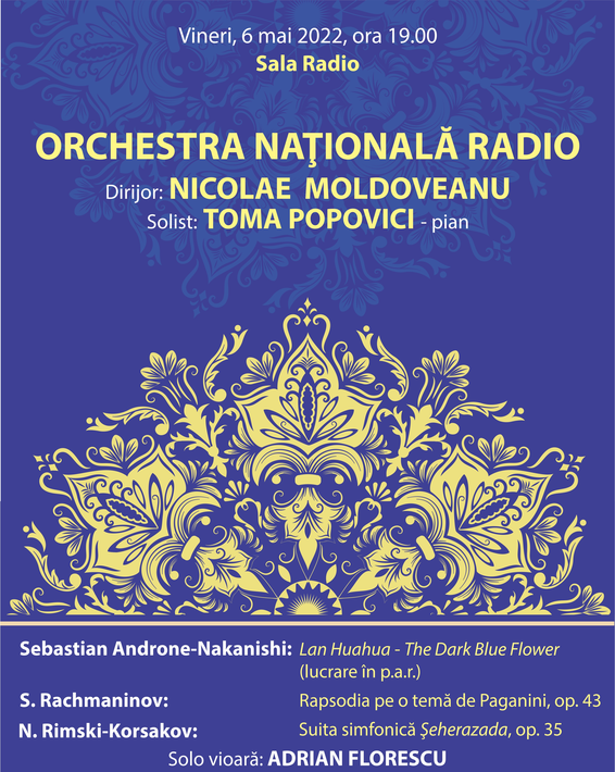 Seara se va încheia cu o călătorie exotică în lumea orientală, prin Suita simfonică Șeherazada (Nikolai Rimski-Korsakov) – solo vioară: Adrian Florescu.