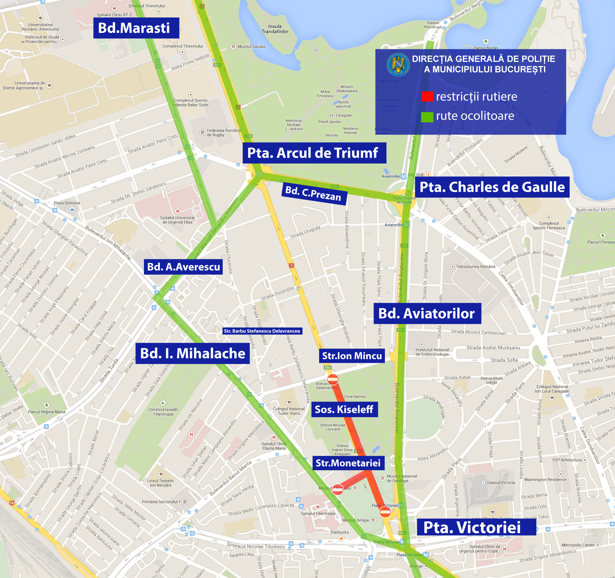 Pentru buna desfășurare a evenimentului, în perioada 13 mai, orele 22:00 – 16 mai, orele 05:00, se va restricționa traficul rutier pe Șoseaua Kiseleff, segmentul de drum cuprins între Strada Arh. Ion Mincu și Piața Victoriei și pe Strada Monetăriei.