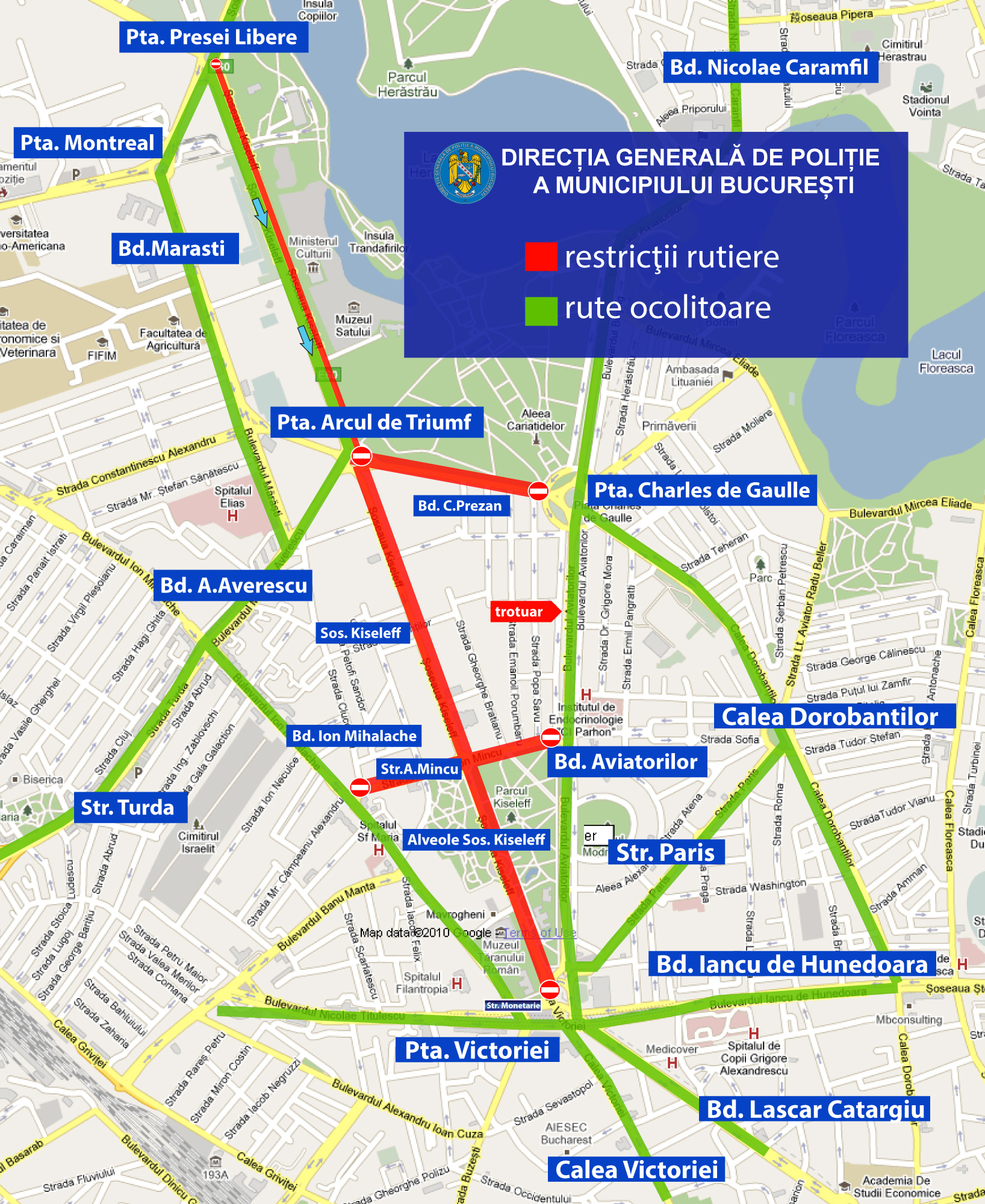 - Bd. Mareșal Constantin Prezan (ambele sensuri), între Piața Charles de Gaulle și Arcul de Triumf, între orele 07:00 – 12:00;