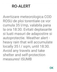 „Evitaţi deplasările şi luaţi măsuri de adăpostire şi autoprotecţie”, este SMS-ul transmis în sistemul RO-Alert, în limbile română şi engleză.