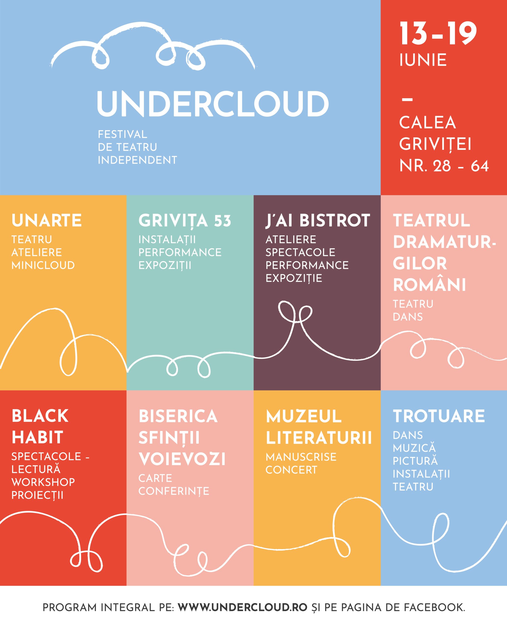 UNDERCLOUD urmează să se desfășoare în 7 spații partenere: Teatrul Dramaturgilor Români, UNARTE, Muzeul Literaturii, Biserica Sfinții Voievozi, J`ai Bistro, Black Habit și Grivița 53.