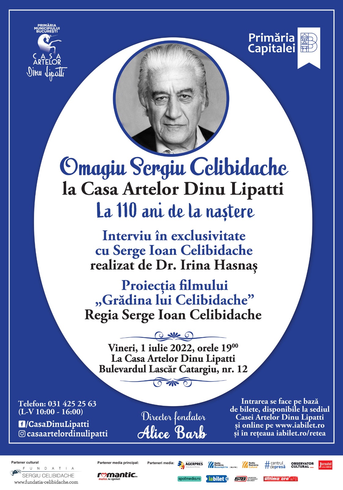 Casa Artelor Dinu Lipatti în parteneriat cu Fundația „Sergiu Celibidache” organizează evenimentul „Omagiu Sergiu Celibidache” în data de 1 iulie 2022, de la orele 19:00, pentru a-l celebra pe marele muzician român, dirijor, compozitor, teoretician și profesor, născut pe 28 iunie/11 iulie 1912 , Roman, Neamț, România, de la a cărui naștere se împlinesc 110 ani.