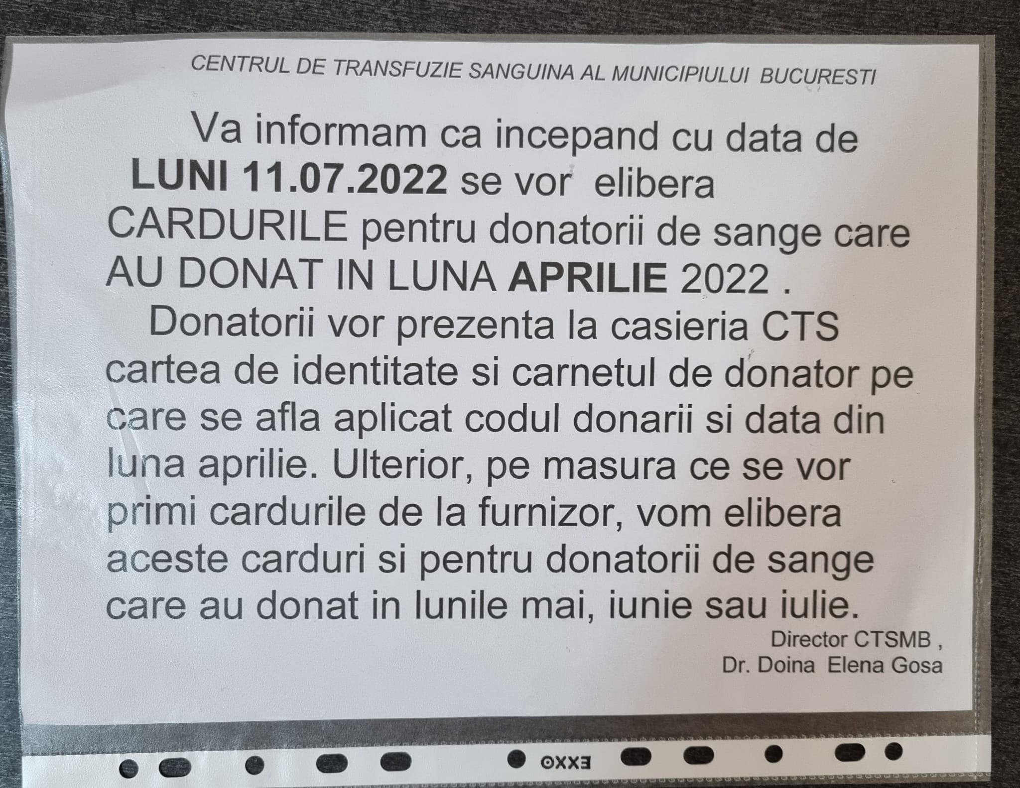 (…) Acest donator trebuie să se prezinte la Centrul de Transfuzie Sanguină București cu carnetul de donator și cu actul de identitate, evident, și își va primi cardul”, a declarat Doina Elena Goșa.