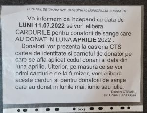 Problema bonurilor valorice pentru hrană la care au dreptul, prin lege, donatorii de sânge și plasmă s-a rezolvat. De luni, 11 iulie, a început distribuirea cardurilor pentru bonurile valorice pentru hrană. Sunt distribuite, mai întâi, cardurile pentru donatorii din luna aprilie.