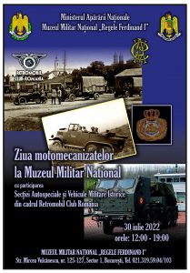Muzeul Militar Național „Regele Ferdinand I” anunță deschiderea, în data de 30 iulie 2022, a expoziției de tehnică militară automobilistică intitulată „Ziua Motomecanizatelor la Muzeul Militar Național”, în colaborare cu Secția Autospeciale și Vehicule Militare Istorice din cadrul Retromobil Club România, la sediul din strada Mircea Vulcănescu nr. 125-127.