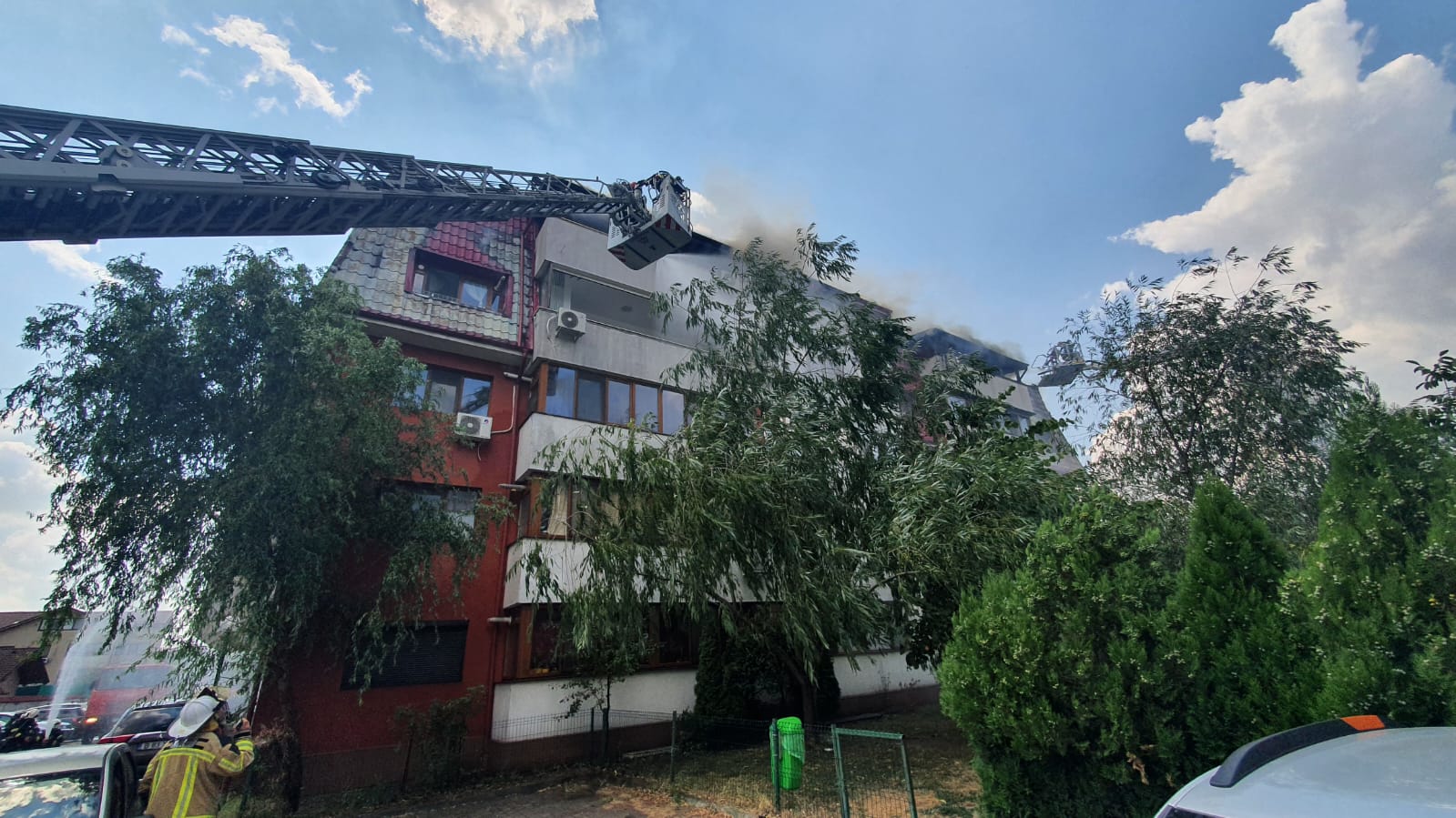 Incendiu la mansarda unui bloc in Popesti Leordeni, cu degajare mare de fum la nivelul intregului acoperis, pe o suprafata de aproximativ 700 mp.