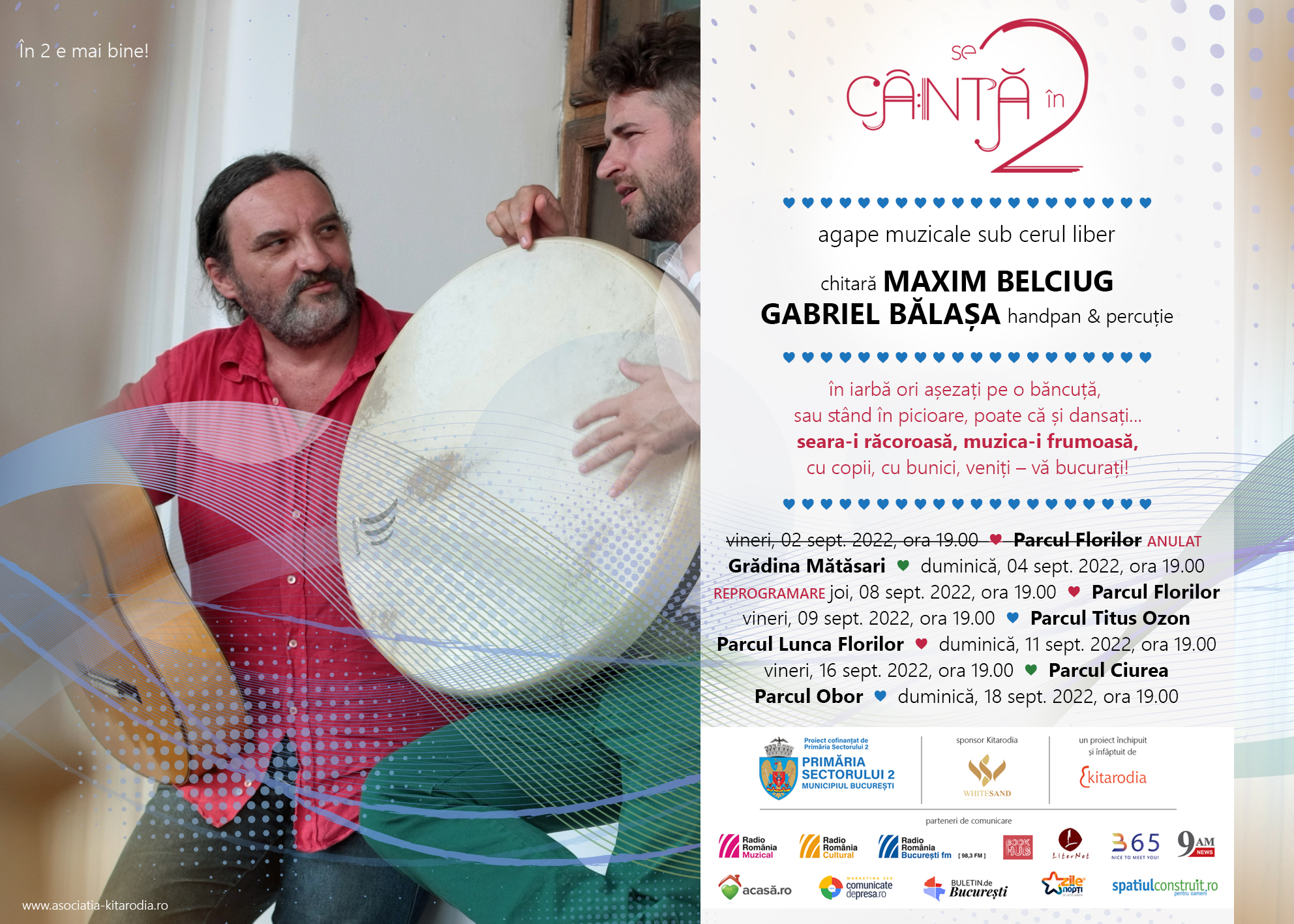 Proiectul „Se cântă în 2” va continua până pe data de 18 septembrie. La toate evenimentele, intrarea pentru public este liberă.