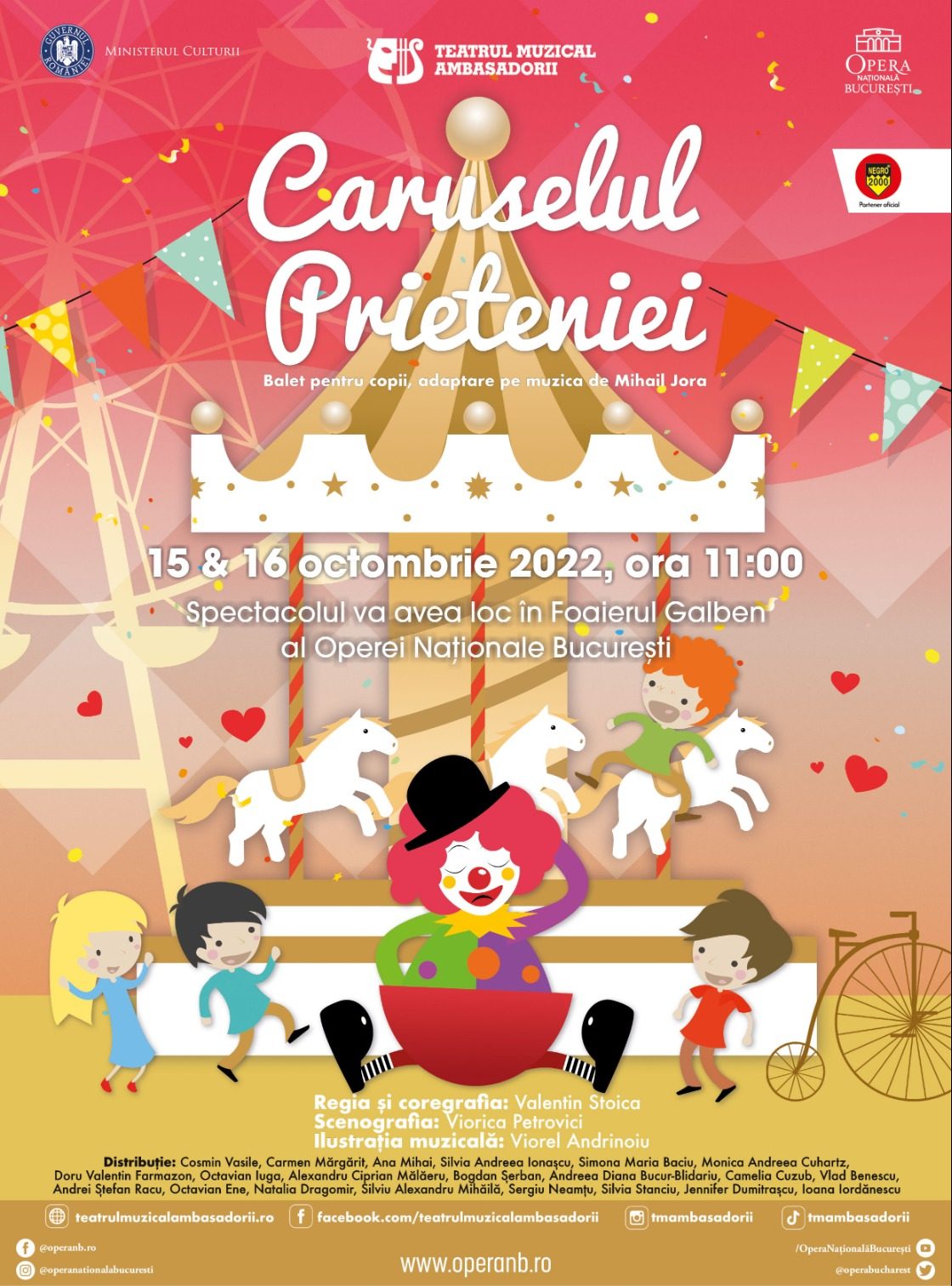 Teatrul Muzical Ambasadorii în parteneriat cu Opera Națională București prezintă sâmbătă, 15 octombrie, și duminică, 16 octombrie, începând cu ora 11:00, spectacolul pentru copii „Caruselul Prieteniei” adaptare pe muzică de Mihail Jora. Spectacolul avea loc în Foaierul Operei Naționale București.