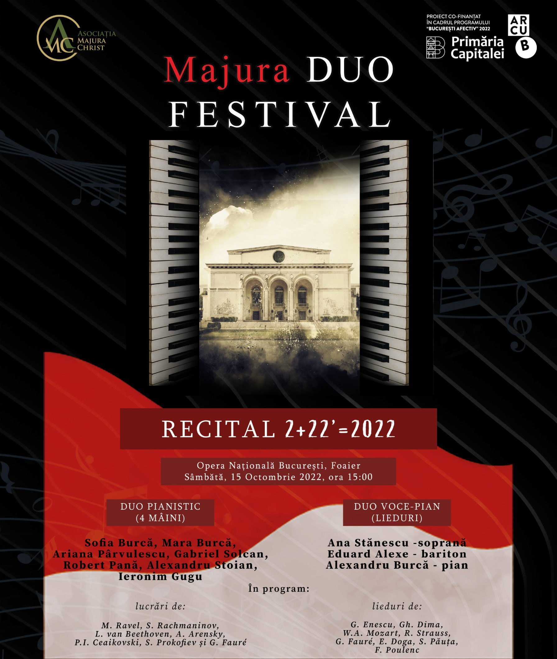 Sâmbătă, 15 octombrie, ora 15:00, în foaierul Operei Naționale București va avea loc recitalul „2+22’= 2022” din cadrul Majura Duo Festival. Cea de-a III-a ediție a Festivalului Internațional „Duo Majura”, organizat de Asociația „Majura Christ”, un eveniment de anvergură națională și internațională, care cuprinde recitaluri de muzică clasică și jazz destinate melomanilor, dar și publicului larg.