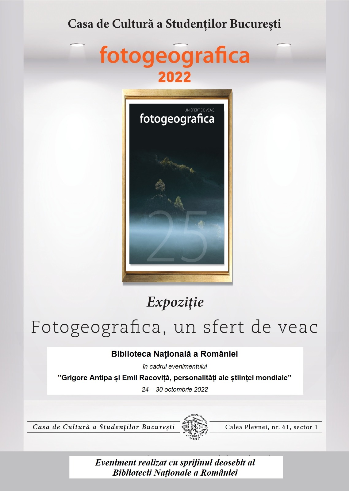 Expoziția Fotogeografica, un sfert de veac va râmâne deschisă în peroada 24 – 30 octombrie 2022 și face parte integrantă dintr-un patrulater cultural, ce se desfășoară în cele mai prestigioase instituții de cultură din țară: Opera Națională București, Teatrul Național ”I.L. Caragiale” București, Biblioteca Națională a României și Casa de Cultură a Studenților București.