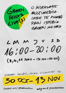 Pe 30 octombrie de la ora 14:00 va avea loc vernisajul expoziției multimedia GREEN HOURS LIVE(S) – o instalație gândită sub forma unui parcurs-expoziție, care va oferi publicului posibilitatea de a face o incursiune afectivă în spațiul și istoria Green Hours.