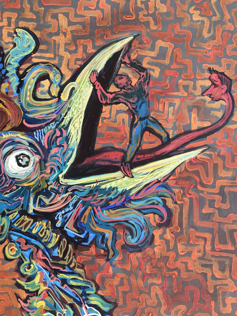 “Creaturile pictate reprezintă gândurile care mă prind în vraja lor. Gândurile par mereu noi, ele sunt însă rezultatul altor gânduri fixate deja în subconștient. Expoziția reprezintă un salt în interior, cautând originea fanteziei mele, dorind să găsesc în amintiri de unde pleacă aceste creaturi, să înțeleg mai bine ce m-a format și unde mă duc, sprijinindu-mă de toiagul amintirilor. Înțelegând acestea, sunt mai împăcat cu drumul și mă simt liber.”, spune artistul.