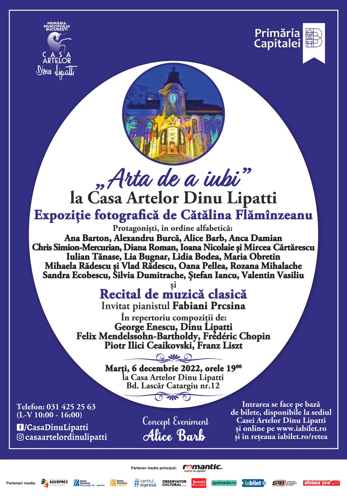Curatorul Expoziției „Arta de a iubi” este Alice Barb, Directorul fondator al Casei Artelor Dinu Lipatti, instituție publică de cultură aflată în subordinea Primăriei Municipiului București. Expoziția va fi deschisă spre vizitare în perioada 7-30 decembrie 2022, de luni până vineri în intervalul orar 10:00 – 16:00, la sediul nostru din Bdul Lascar Catargiu nr. 12 și în timpul evenimentelor culturale, cu bilete care pot fi achiziționate de la sediu.