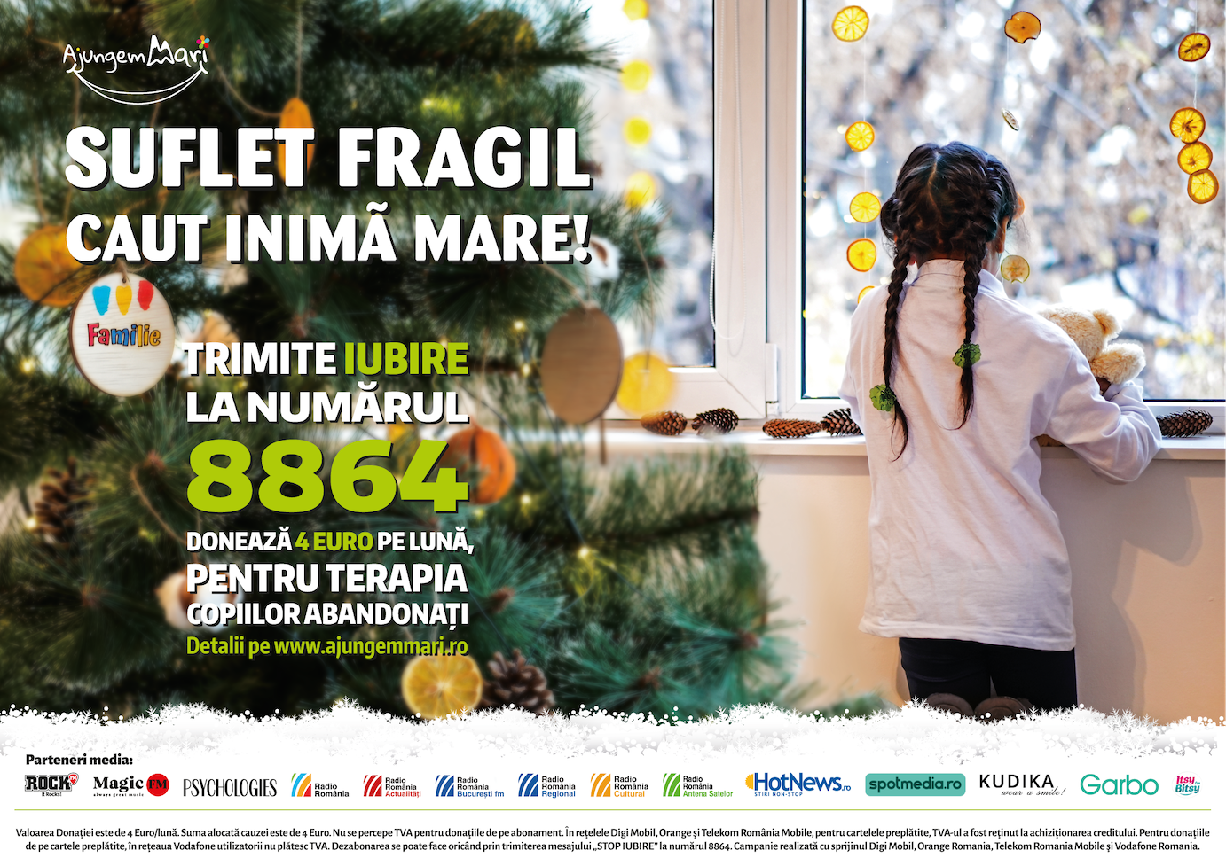Un brad pe care să nu îl mai despodobim după Crăciun, pentru că ei au nevoie de sprijinul nostru și după Sărbători. Terapia este un proces de durată, iar de cele mai multe ori, pentru rezultate vizibile este nevoie de cel puțin 1 an de psihoterapie. Donează pentru copiii abandonați și ajută-i să meargă la ședințe de psihoterapie.” – Vivianda Nicolae, Vicepreședinte Ajungem MARI.