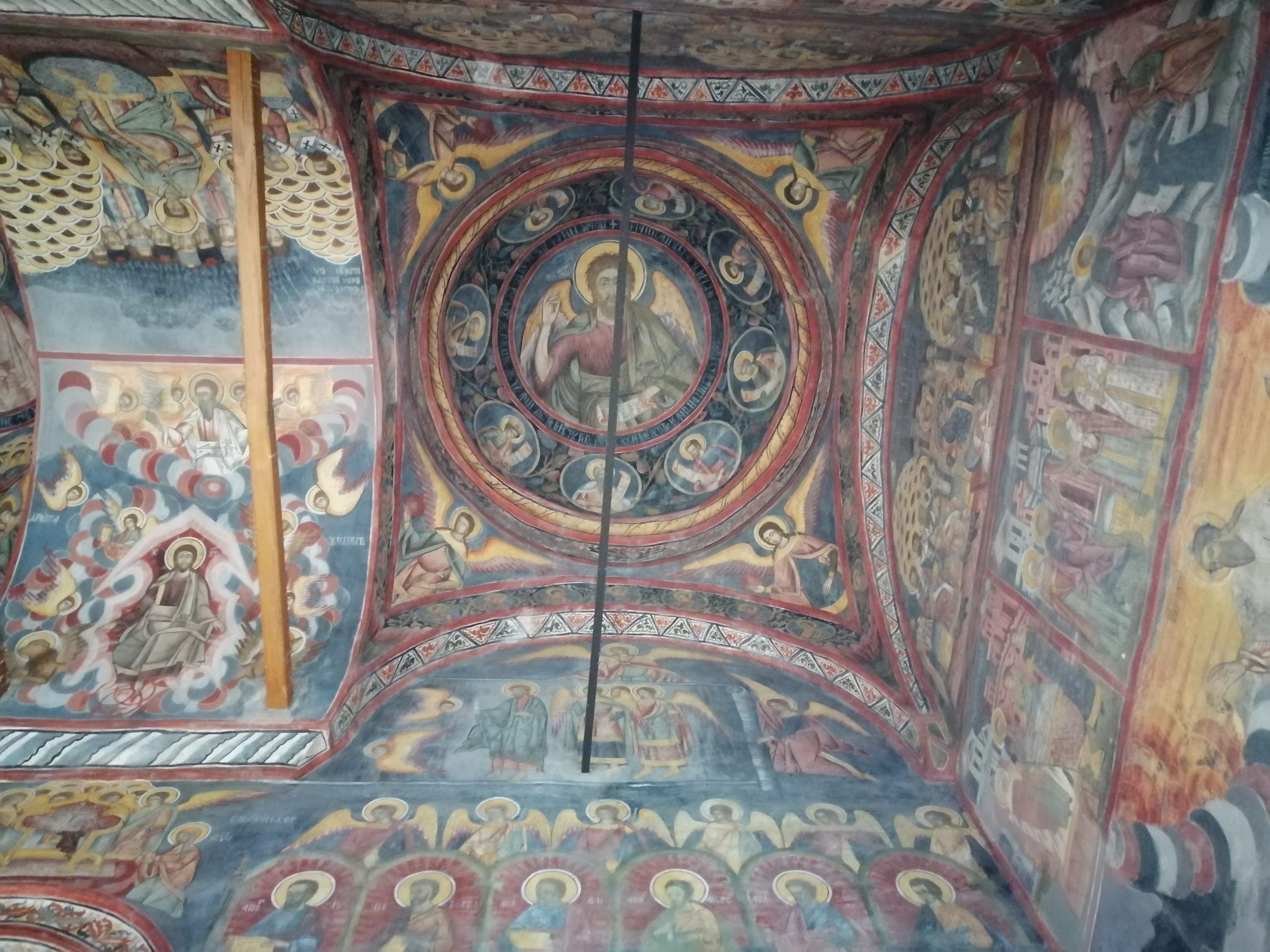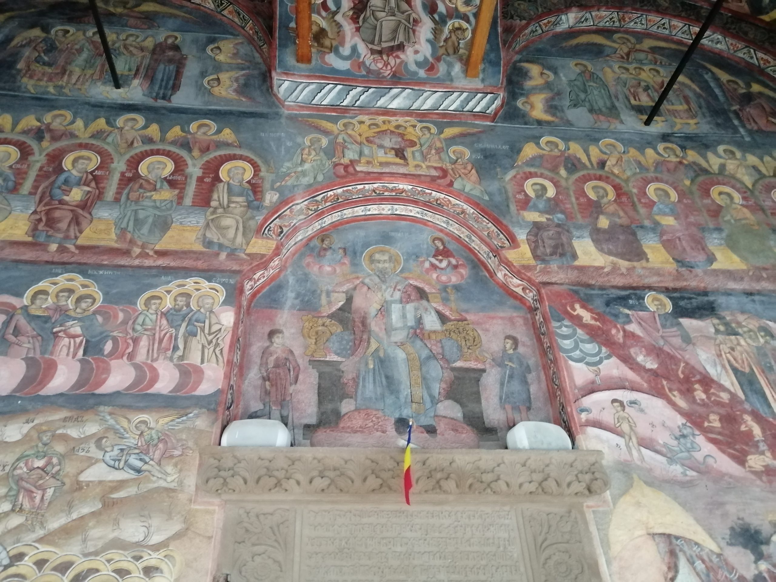 Pictura din interiorul bisericii a fost distrusă de focul cel Mare. Dar cea din pridvor a scăpat și ne dezvăluie un superb canon de factura lui Pârvu Mutu.