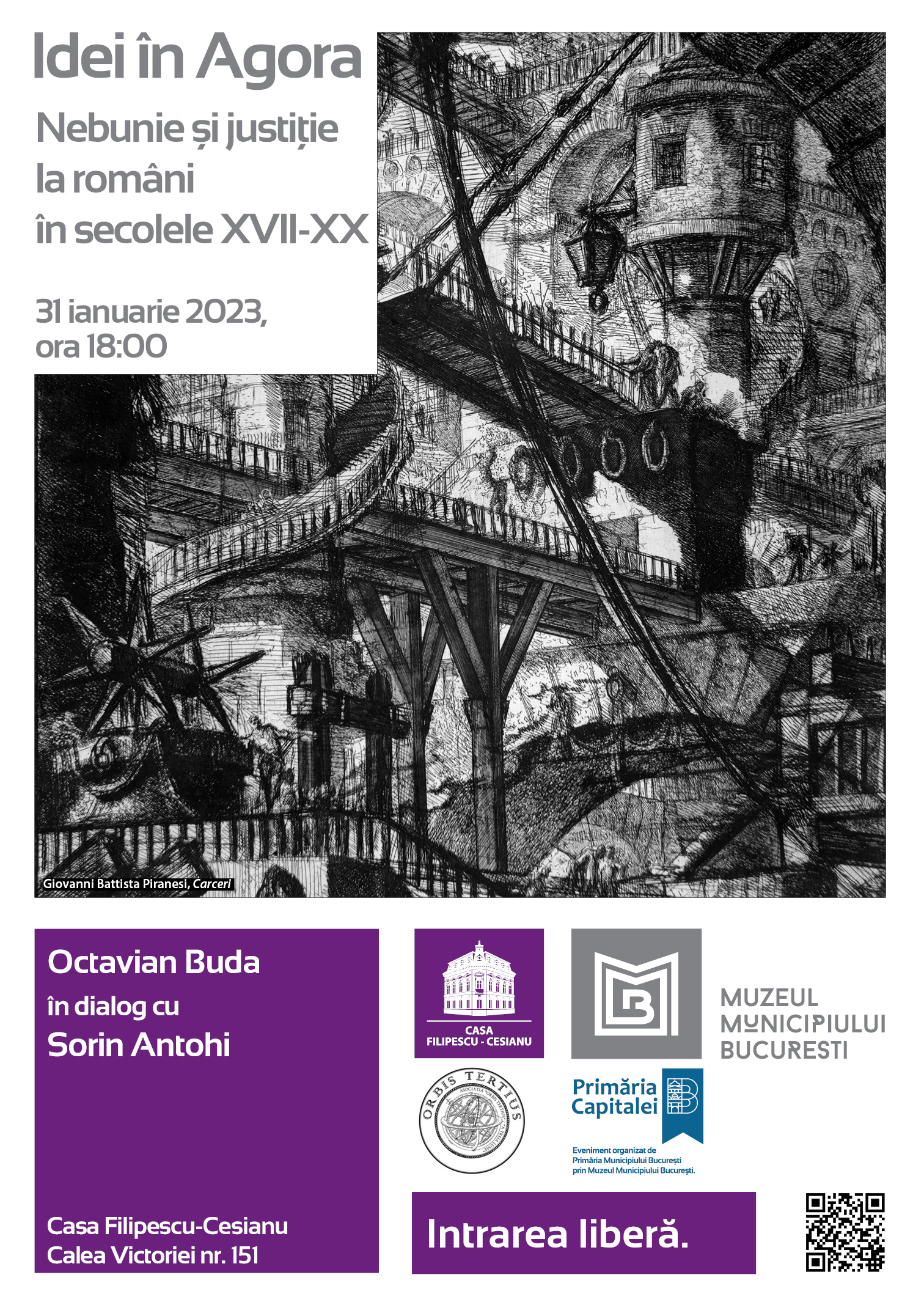 Muzeul Municipiului București invită publicul la Idei în Agora, marți, 31 ianuarie 2023, ora 18:00. Întâlnirea va avea loc la Casa Filipescu-Cesianu (Calea Victoriei 151). Octavian Buda va fi în dialog cu Sorin Antohi, pe tema: „Nebunie și justiție la români în secolele XVII-XX”. Intrarea este liberă.