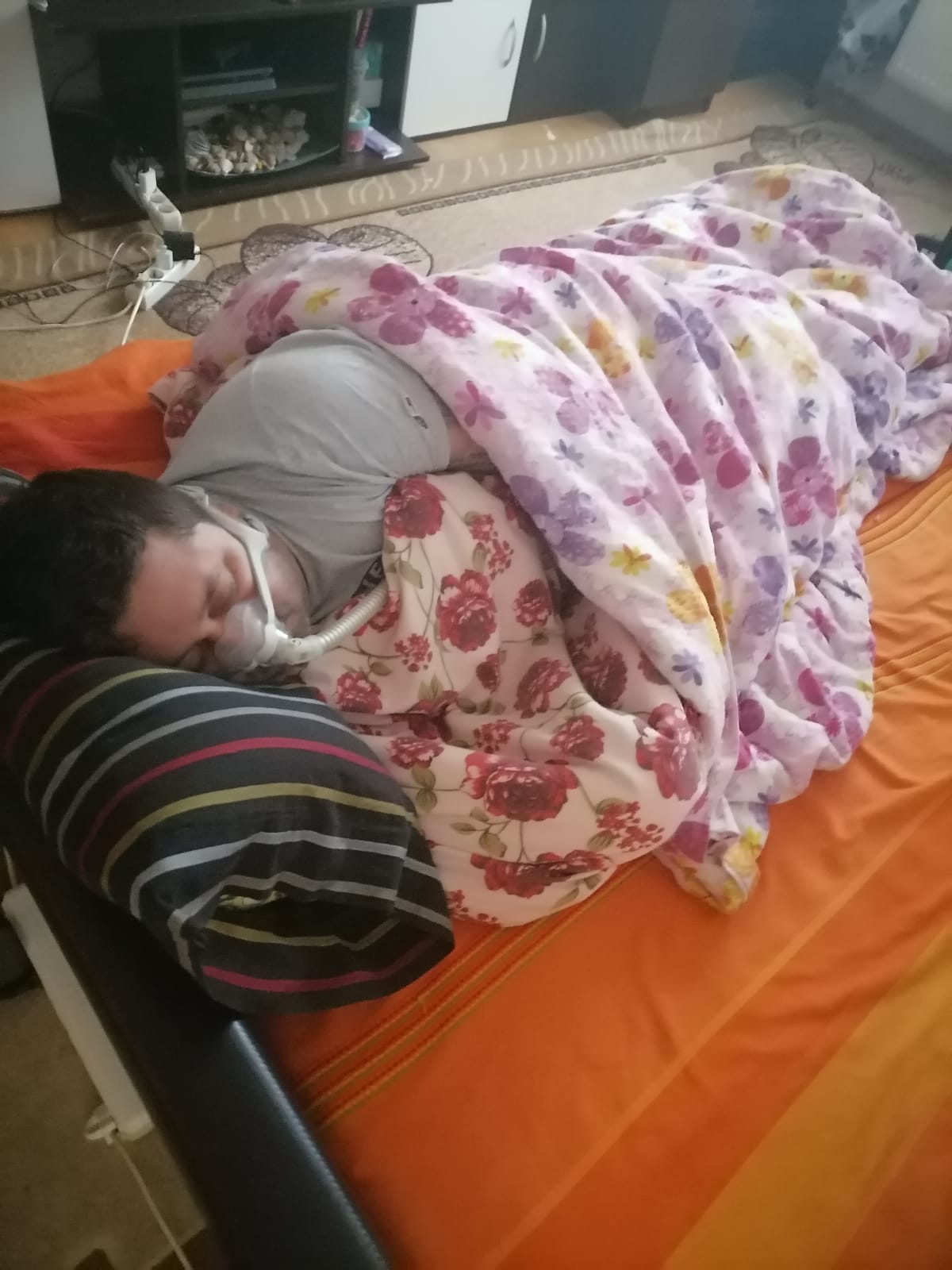 În blocul fără curent electric locuiesc – după cum puteți vedea din fotografii, inclusiv o bătrână care face dializă și un bărbat dependent de oxigen, care folosește o baterie de mașină, pentru a-și alimenta instalația care îl ține în viață.