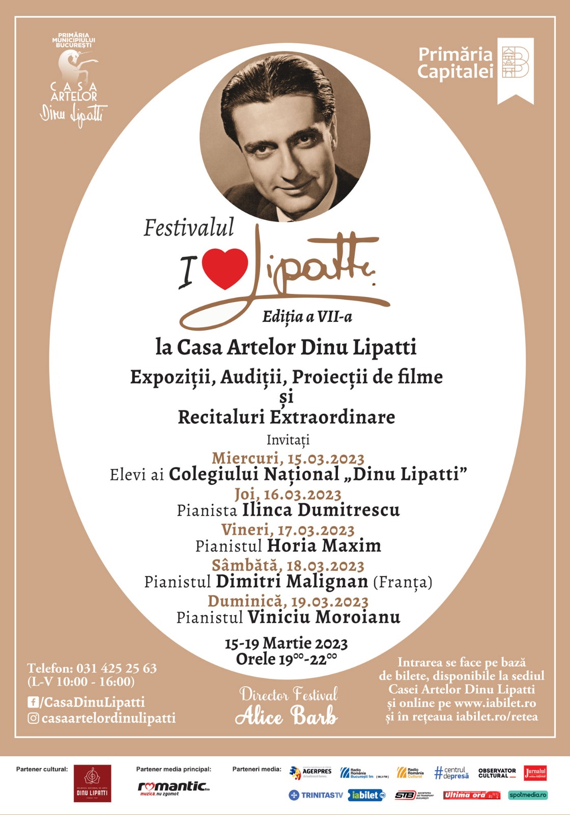 Casa Artelor Dinu Lipatti vă invită în perioada 15-19 martie 2023 la cea de-a VII-a ediție a Festivalului „I love Lipatti”, dedicată împlinirii a 106 ani de la nașterea compozitorului și celui mai mare pianist român al tuturor timpurilor, Dinu Lipatti (19 martie 1917 – 2 decembrie 1950) și împlinirii a cinci ani de la inaugurarea Centrului Cultural „Casa Artelor Dinu Lipatti”.