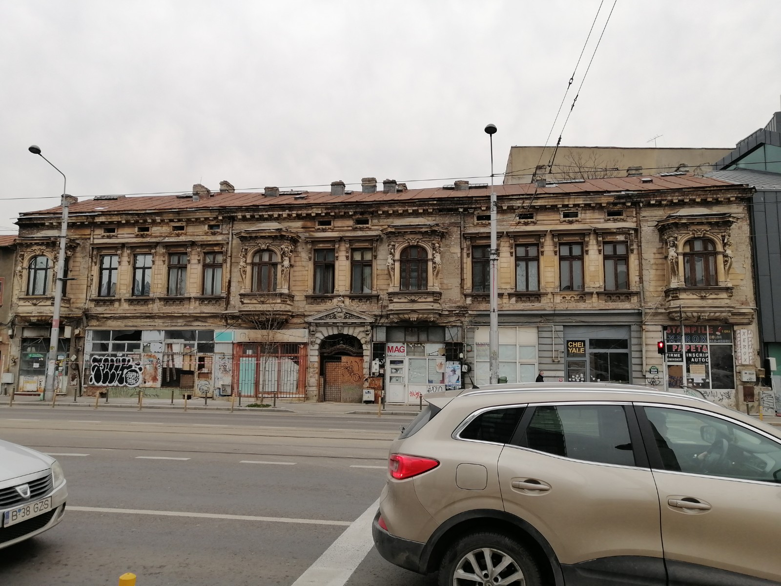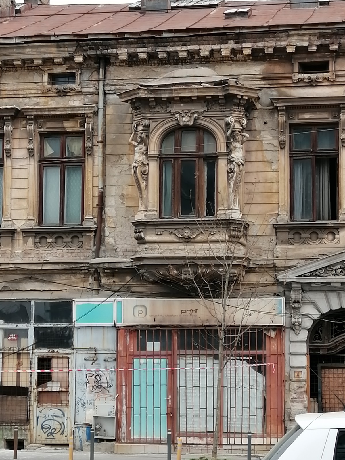 Bucăți mari de tencuială, elemente decorative de la cornișele imobilelor, altădată impunătoare și frumoase,atarna trist la etajele superioare si risca sa se prabuseasca in orice moment.