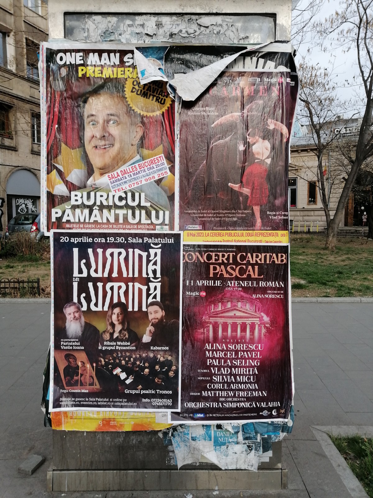Peste tot, pe ziduri, pe vitrinele magazinelor abandonate, pe stâlpi, pe transformatoarele de curent electric, zeci și sute de afișe, lipite unele peste altele, udate de ploi și dezlipite de vânturi formează un fel de tapet soios, zdrențuit și urât mirositor.