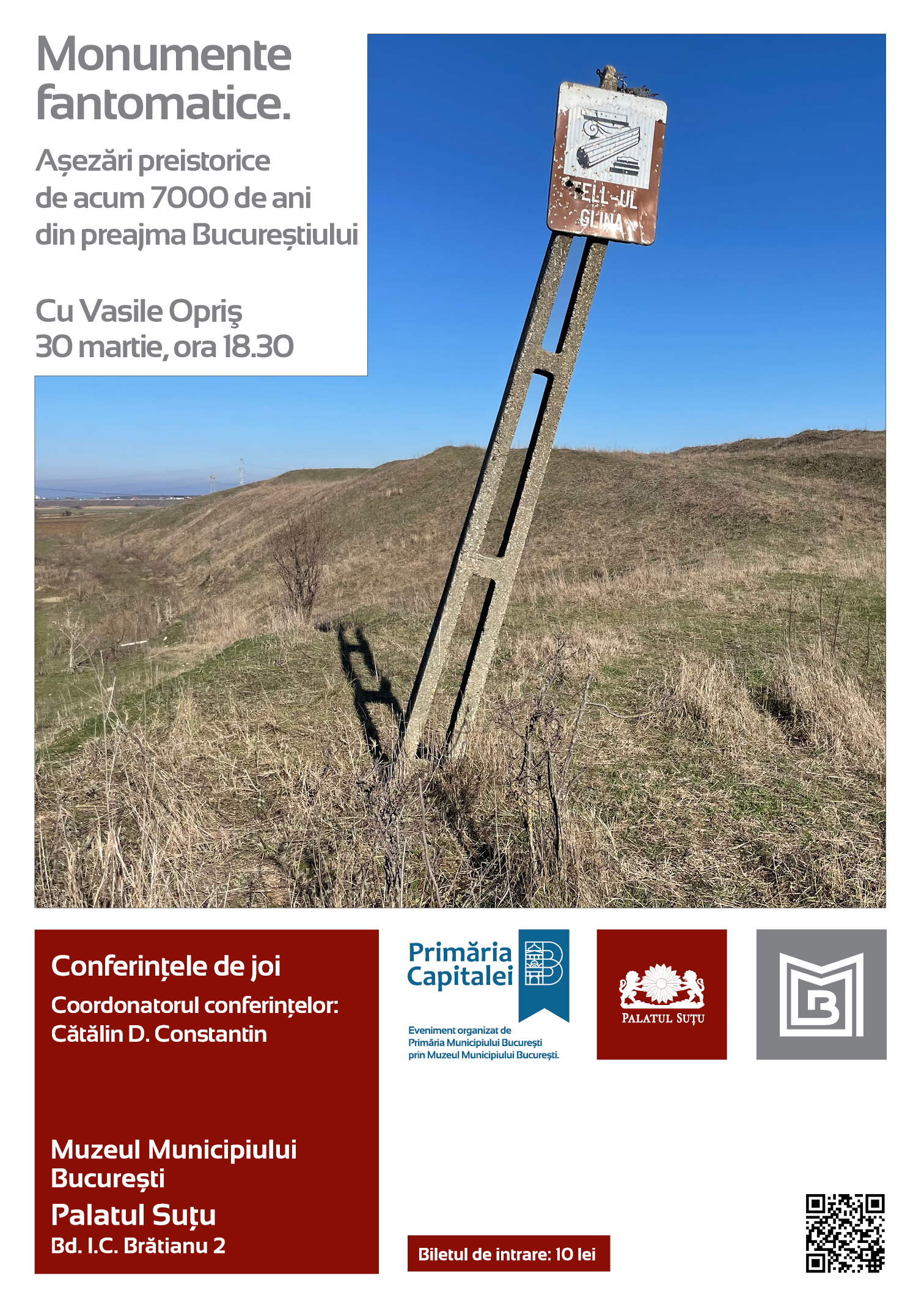 Muzeul Municipiului București invită publicul la conferința de joi, 30 martie, ora 18:30, care va avea loc la Palatul Suțu (Bd Ion C Brătianu, nr 2) cu tema „Monumente fantomatice. Așezări preistorice de acum 7000 de ani din preajma Bucureștiului” susținută de dr. Vasile Opriș, șeful Secției Istorie din cadrul MMB, arheolog cu experiență în cercetarea siturilor preistorice, specializat în studiul neo-eneoliticului și ceramicii preistorice.