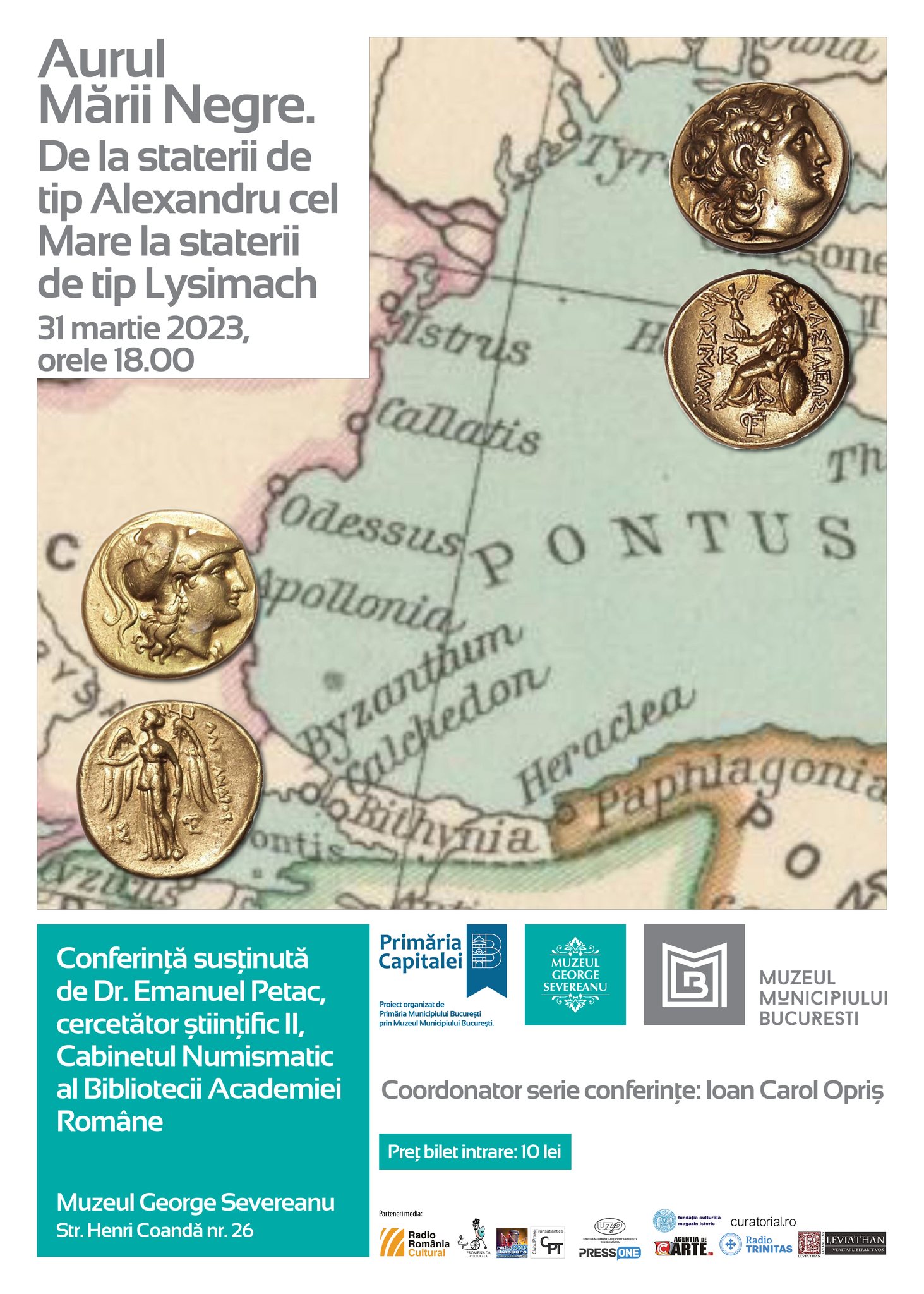 Muzeul Municipiului București invită publicul vineri, 31 martie 2023, ora 18:00, la conferința cu tema „Aurul Mării Negre. De la staterii de tip Alexandru cel Mare la staterii de tip Lysimach”, care va avea loc la Muzeul George Severeanu (Str. Henri Coandă nr. 26) și va fi prezentată de dr. Emanuel Petac, conservatorul fabuloasei colecții numismatice a Academiei Române.