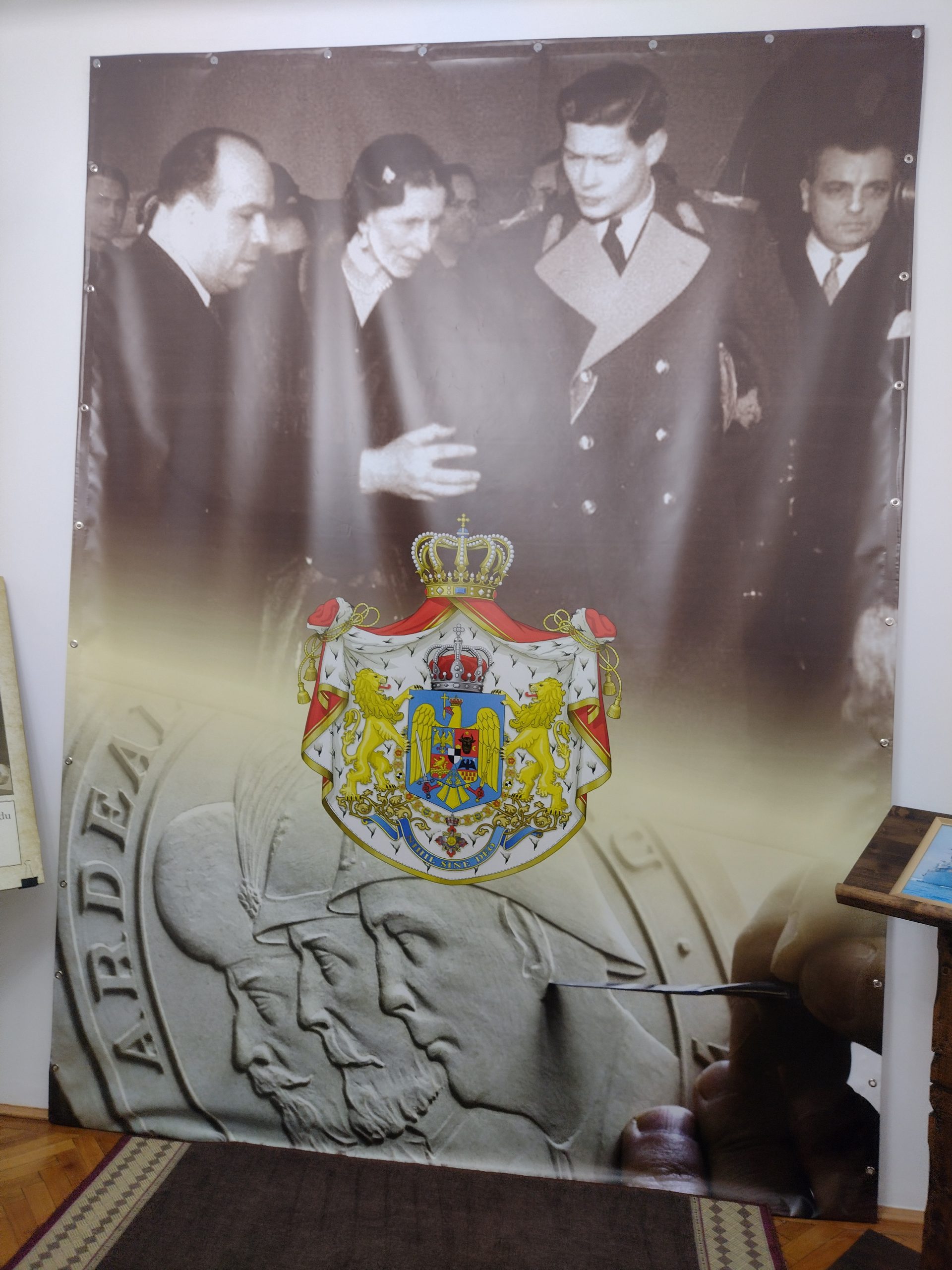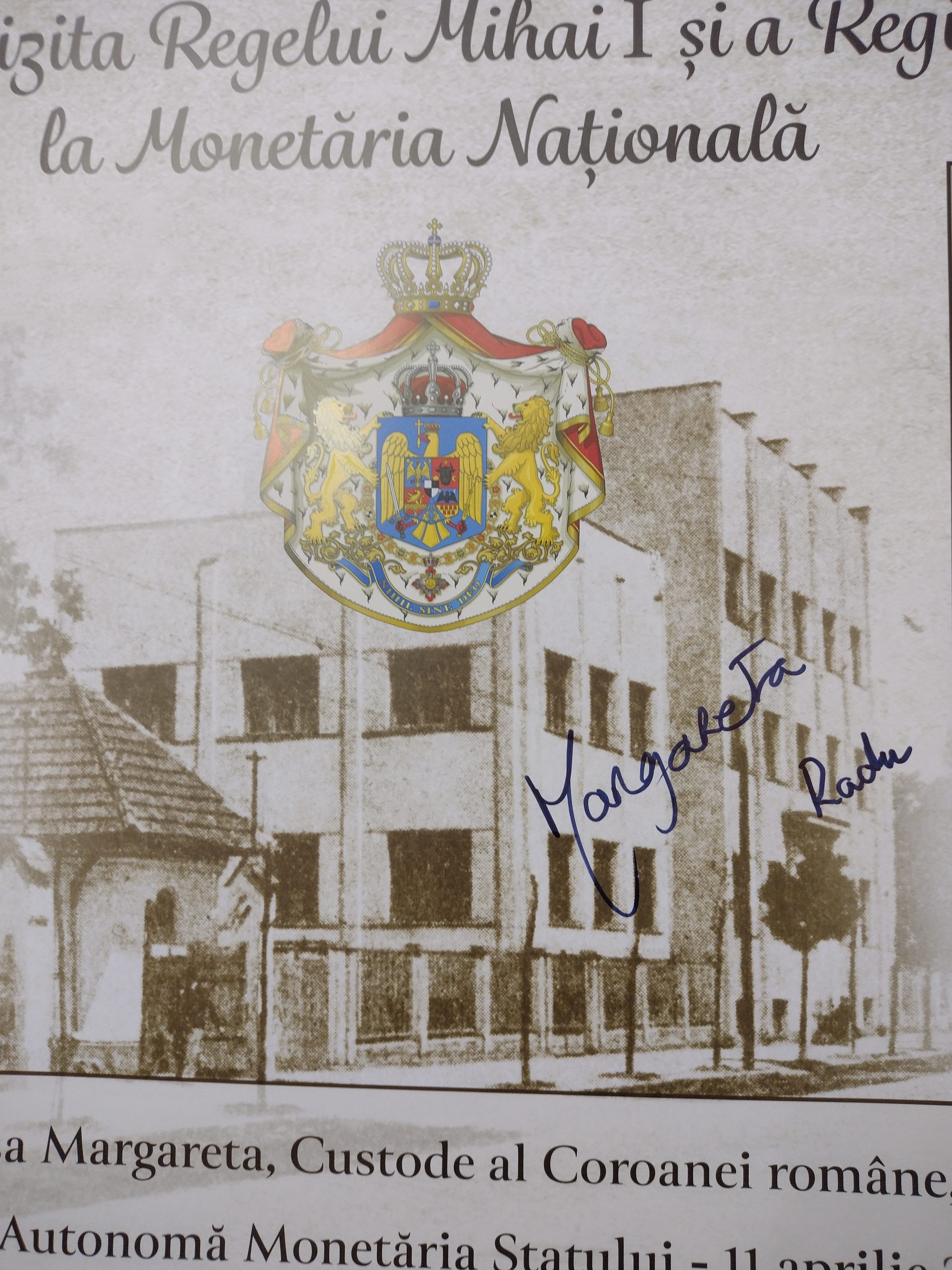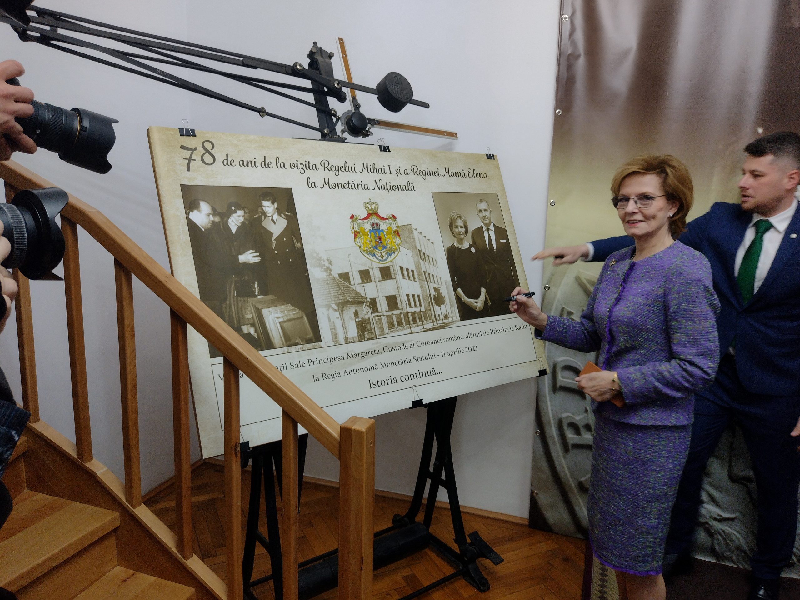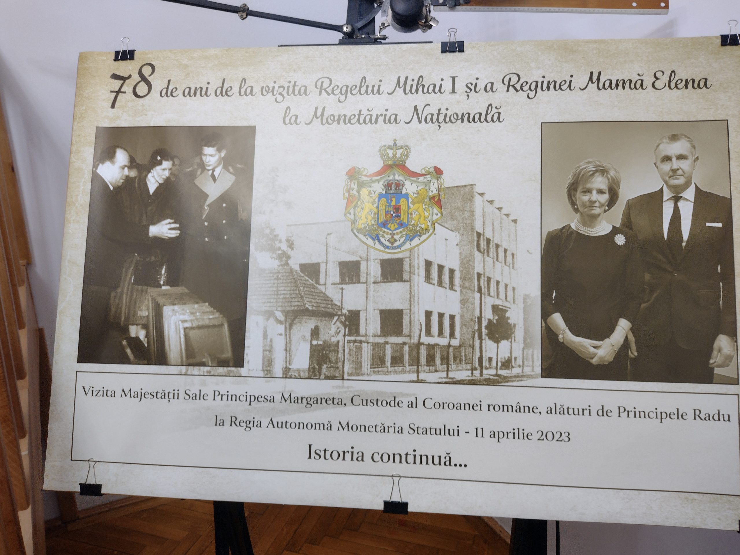 a fost realizat un panou special, ce simbolizeaza un arc peste timp, cu portretele Regelui Mihai I si Reginei Ana, fatada Monetariei Statului in centru si portretele Majestatii Sale Margareta si Altetei Sale Regale Principele Radu in dreapta. Panoul a fost semnat de catre cel doi invitati.