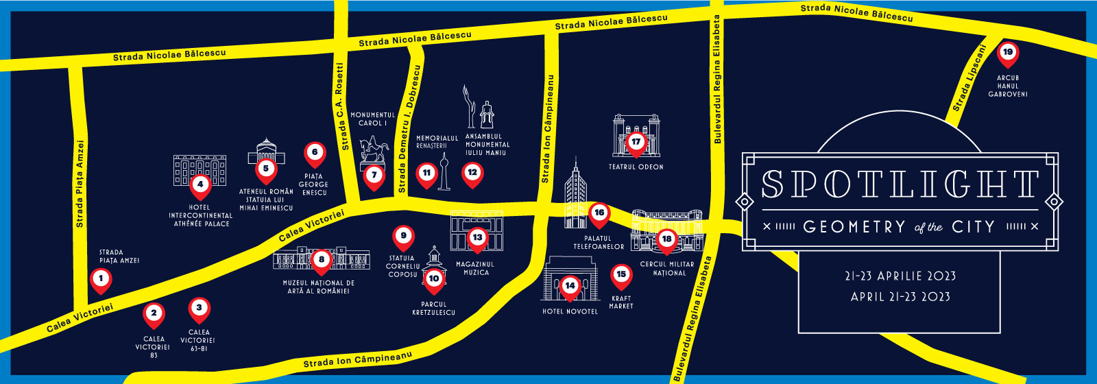 În weekendul 21-23 aprilie 2023, Spotlight invită publicul să exploreze un oraş reinventat de arta new media prin zeci de instalaţii şi proiecţii de light-art pe Calea Victoriei şi la ARCUB – Hanul Gabroveni. De la statuia lui Mihai Eminescu din parcul Ateneului transformată într-un joc vizual, la Palatul Telefoanelor escaladat de personaje ilustrate, la Teatrul Odeon devenit teren de joacă sau parcul Kretzulescu devenit o grădină de flori din lumină, Spotlight – Geometry of the City a pregătit pentru bucureşteni o aventură vizuală spectaculoasă. Traseul Spotlight din acest an începe de la intersecţia Calea Victoriei cu strada Piaţa Amzei şi continuă de-a lungul acesteia până la Cercul Militar, cu o ultimă oprire în Centrul vechi, la ARCUB – Hanul Gabroveni.