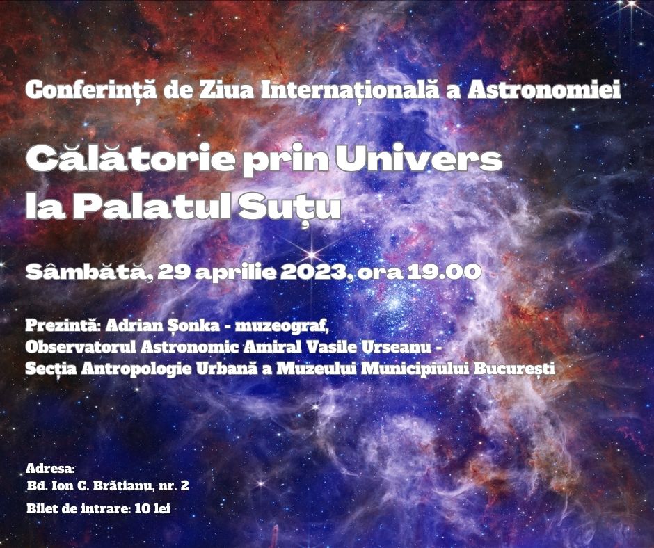 Cu ocazia Zilei Internaționale a Astronomiei, Muzeul Municipiului București invită publicul sâmbătă, 29 aprilie 2023, ora 19:00, la Palatul Suțu (Bd Ion C. Brătianu, nr. 2), la o conferință specială care marchează acest eveniment. Ea va fi susținută de Adrian Șonka, muzeograf, Observatorul Astronomic Amiral Vasile Urseanu – Secția Antropologie Urbană a Muzeului Municipiului București.