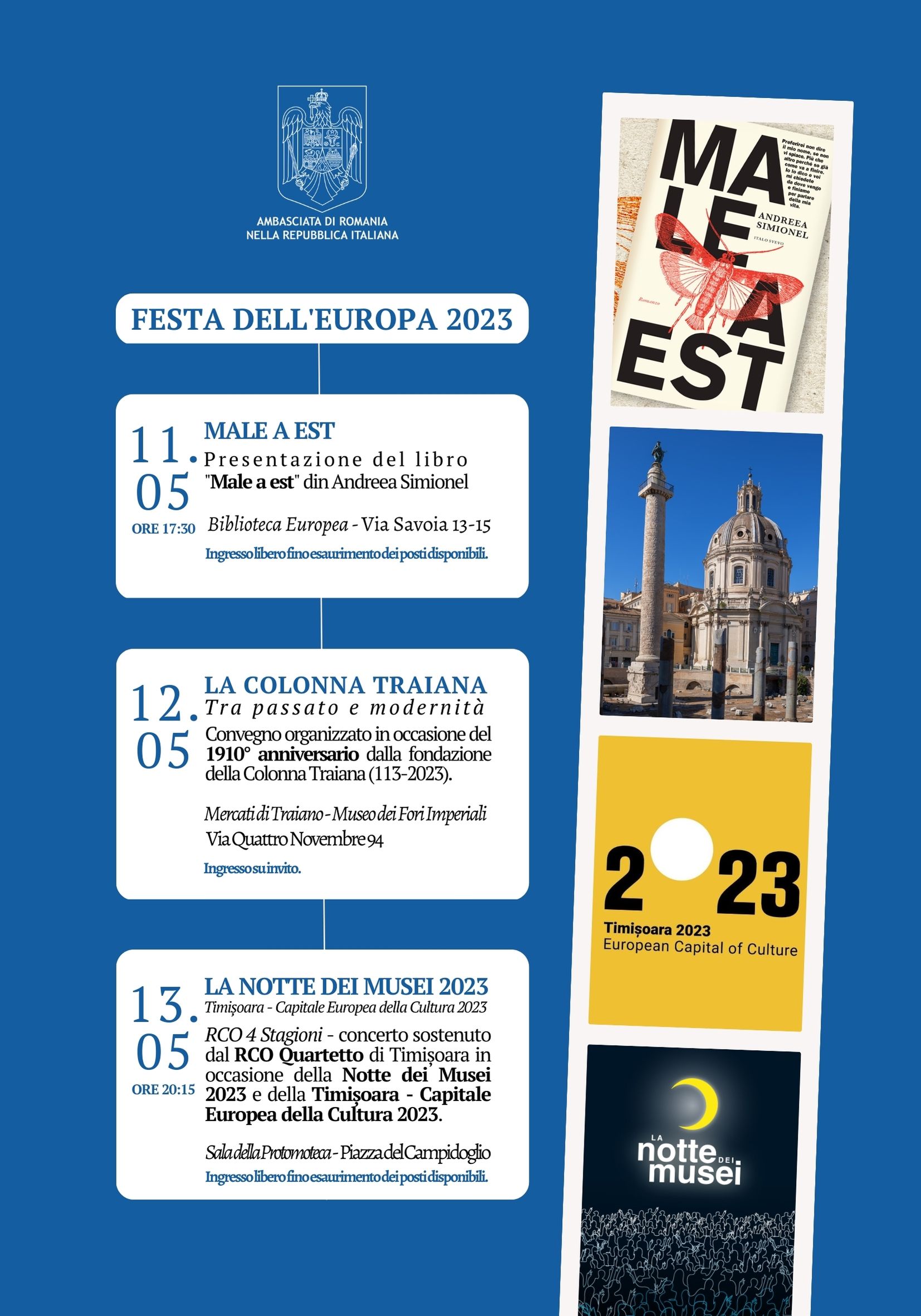 Pentru marcarea Zilei Europei, sărbătorită în 9 mai, dată reper pentru întreaga Uniune Europeană și cetățenii acesteia și moment care trebuie să ne facă să reflectăm la apartenența la aceeași comunitate de valori și principii și la necesitatea unei viziuni comune asupra viitorului continentului european, Ambasada României în Republica Italiană va organiza o serie de evenimente dedicate celebrării excelenței culturale românești și relațiilor dinamice dintre România și Italia.