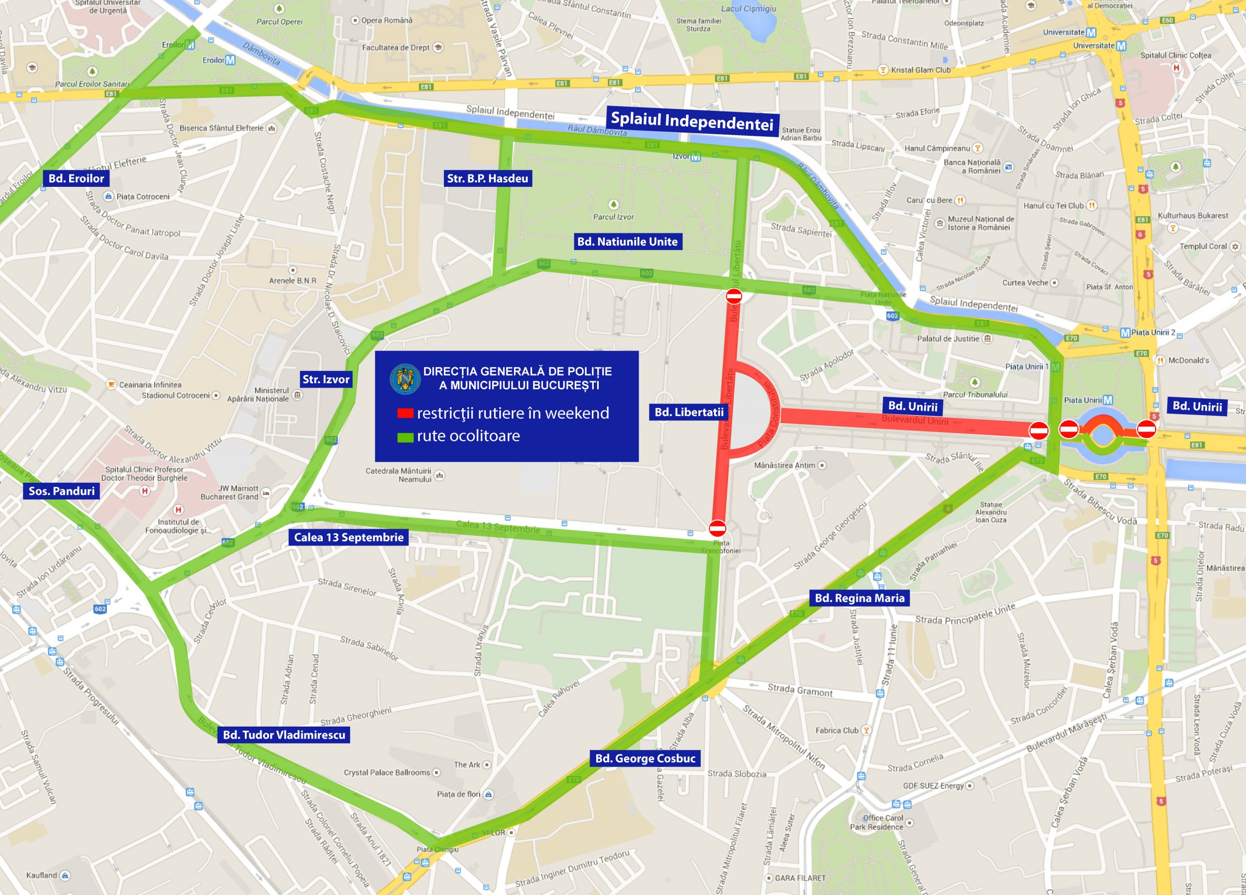 - Sâmbătă, 13.05.2023, ora 15.00 – duminică, 14.05.2023, ora 14.30, pe Bd. Libertății (între bretelele Piața Constituției, sensul dinspre Calea 13 Septembrie către Bd. Națiunile Unite) – amenajare zona Finish.