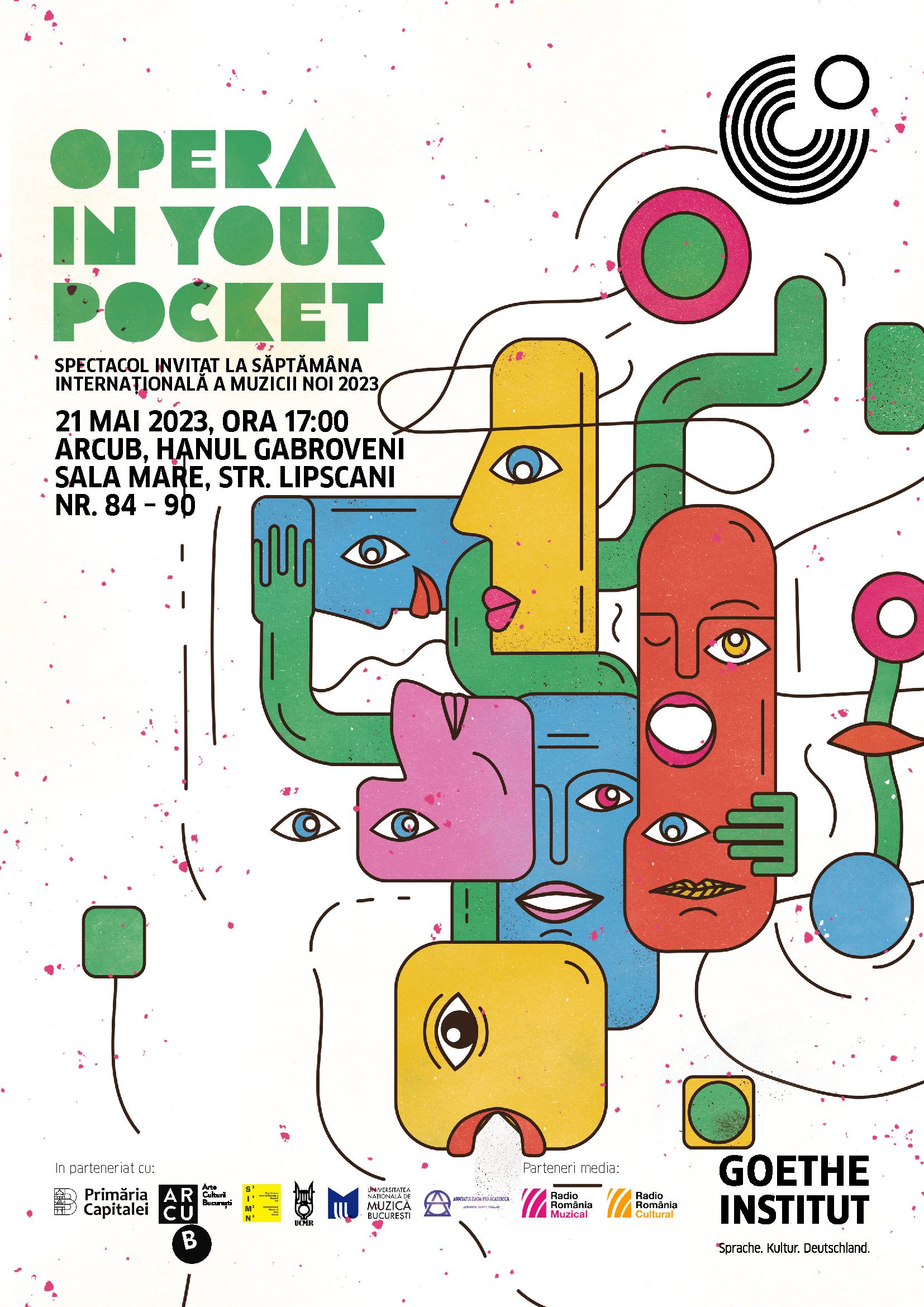 Un proiect-pilot iniţiat de Goethe-Institut şi jucat în premieră anul trecut, „Opera in Your Pocket” este prezentat, de această dată, în variantă de concert şi marchează deschiderea celui mai important festival de muzică contemporană din România, Săptămâna Internaţională a Muzicii Noi de la Bucureşti.