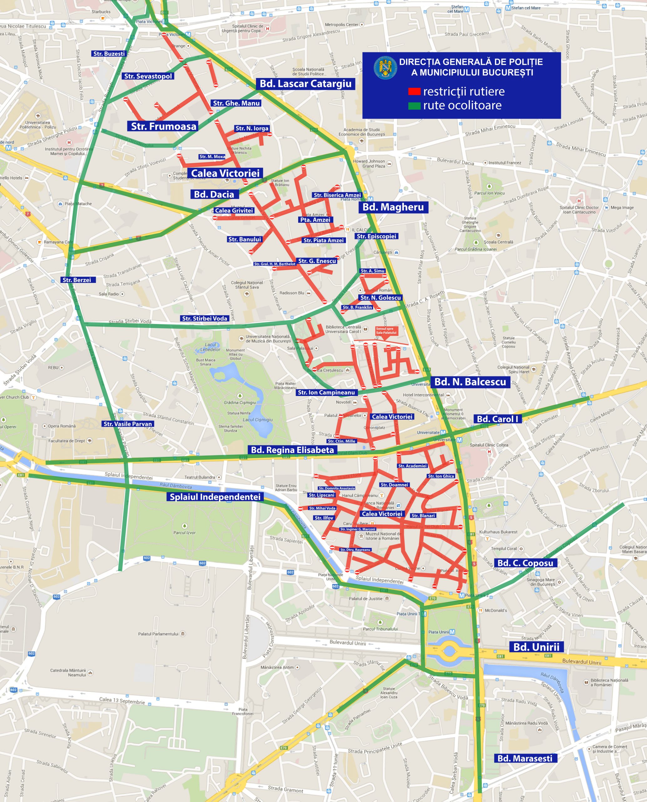 Pe durata restricțiilor instituite se va permite traversul pe Calea Victoriei, la intersecțiile cu Str. Sevastopol, Str. Gheorghe Manu, Bd. Dacia, Str. Ion Câmpineanu, Bd. Regina Elisabeta, Str. Știrbei Vodă. Totodată, se va permite circulația pe Calea Victoriei, pe tronsonul cuprins între Str. Știrbei Vodă și Str. Dem. I. Dobrescu.