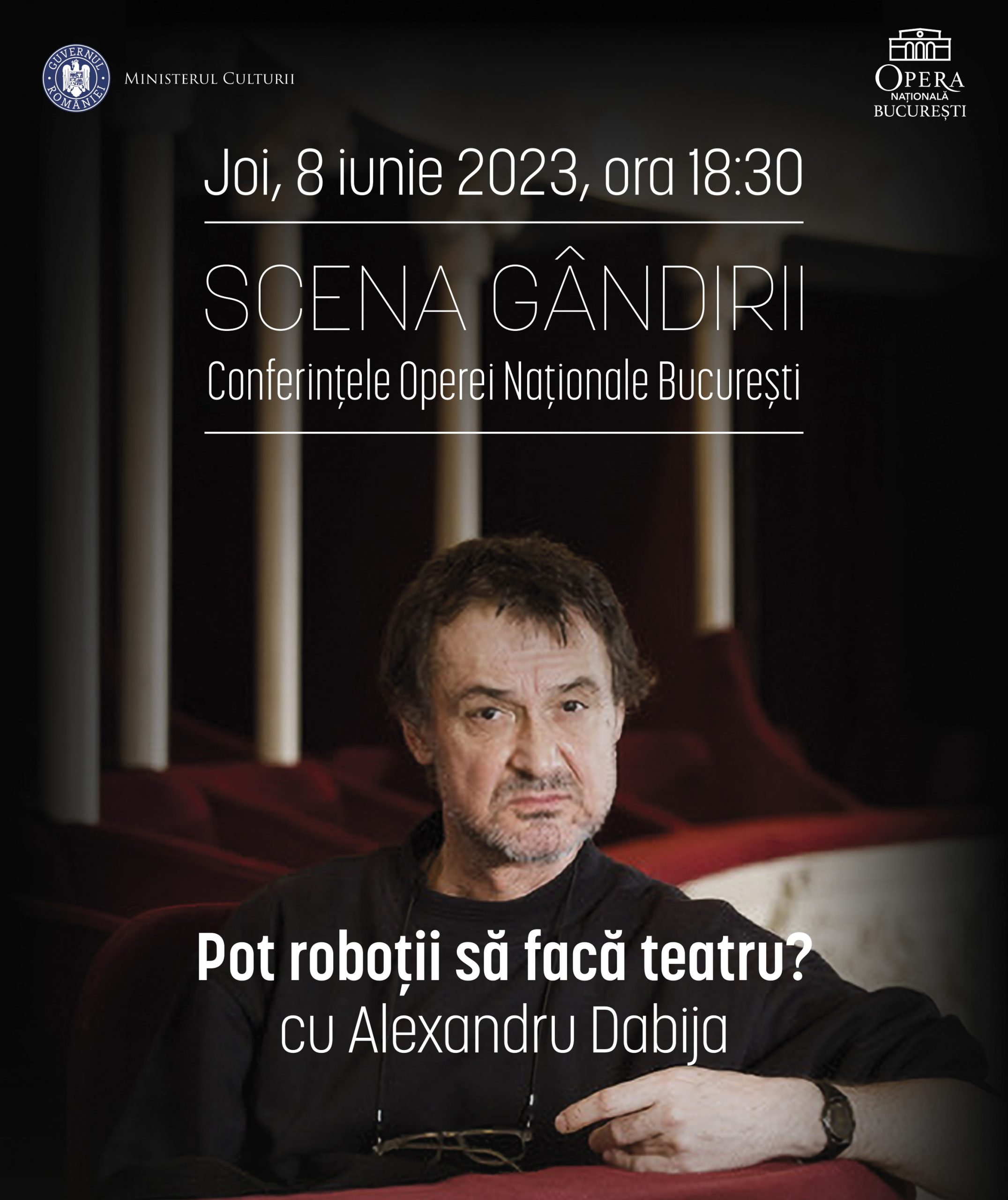 Opera Națională București prezintă joi, 8 iunie, de la ora 18:30, Conferințele Operei Naționale București – SCENA GÂNDIRII, care îl va avea ca invitat pe regizorul Alexandru Dabija, care va susține prelegerea „Pot roboții să facă teatru?”.