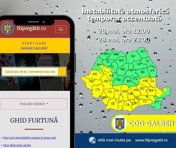 Administraţia Naţională de Meteorologie (ANM) a emis o atenţionare Cod galben de instabilitate atmosferică temporar accentuată, valabilă pe parcursul acestei zile în 24 de judeţe şi în zona Municipiului Bucureşti.