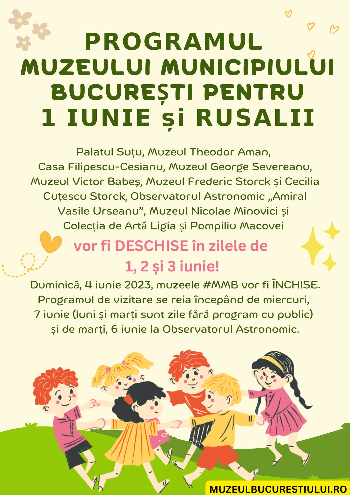 Duminică, 4 iunie 2023, muzeele din structura Muzeului Municipiului București vor fi închise. Vizitele se vor relua de miercuri, 7 iunie (luni și marți sunt zile fără program cu public), iar Observatorul Astronomic Amiral Vasile Urseanu se va redeschide începând de marți, 6 iunie.